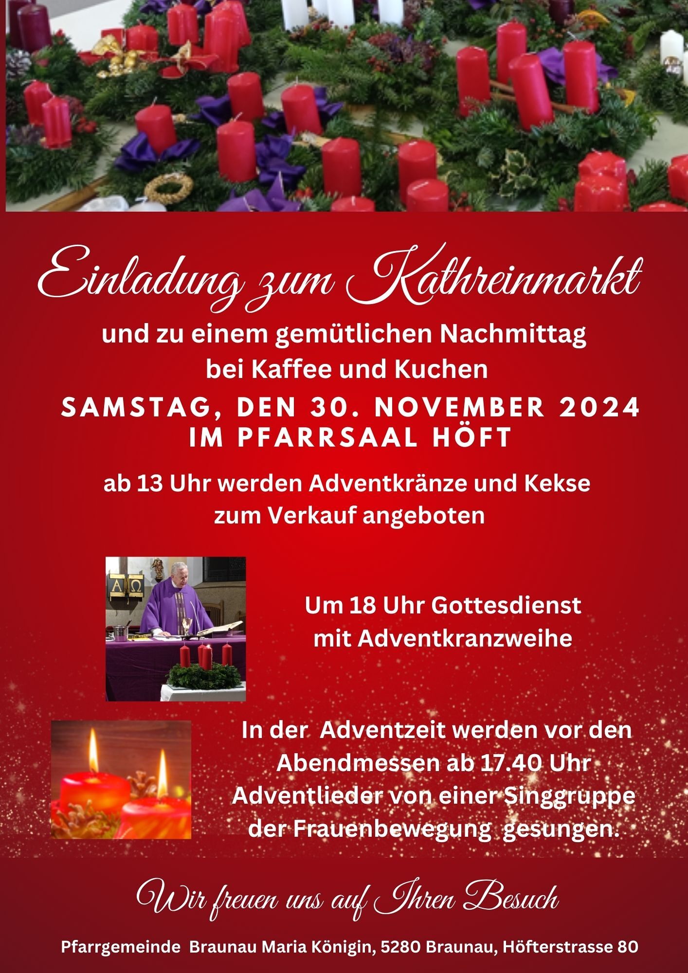 Am 30. November laden wir ab 13 Uhr zum Kathreinmarkt und einem gemütlichen Nachmittag bei Kuchen und Kaffee. Es werden Adventkränze und selbstgemachte Kekse zum Kauf angeboten.