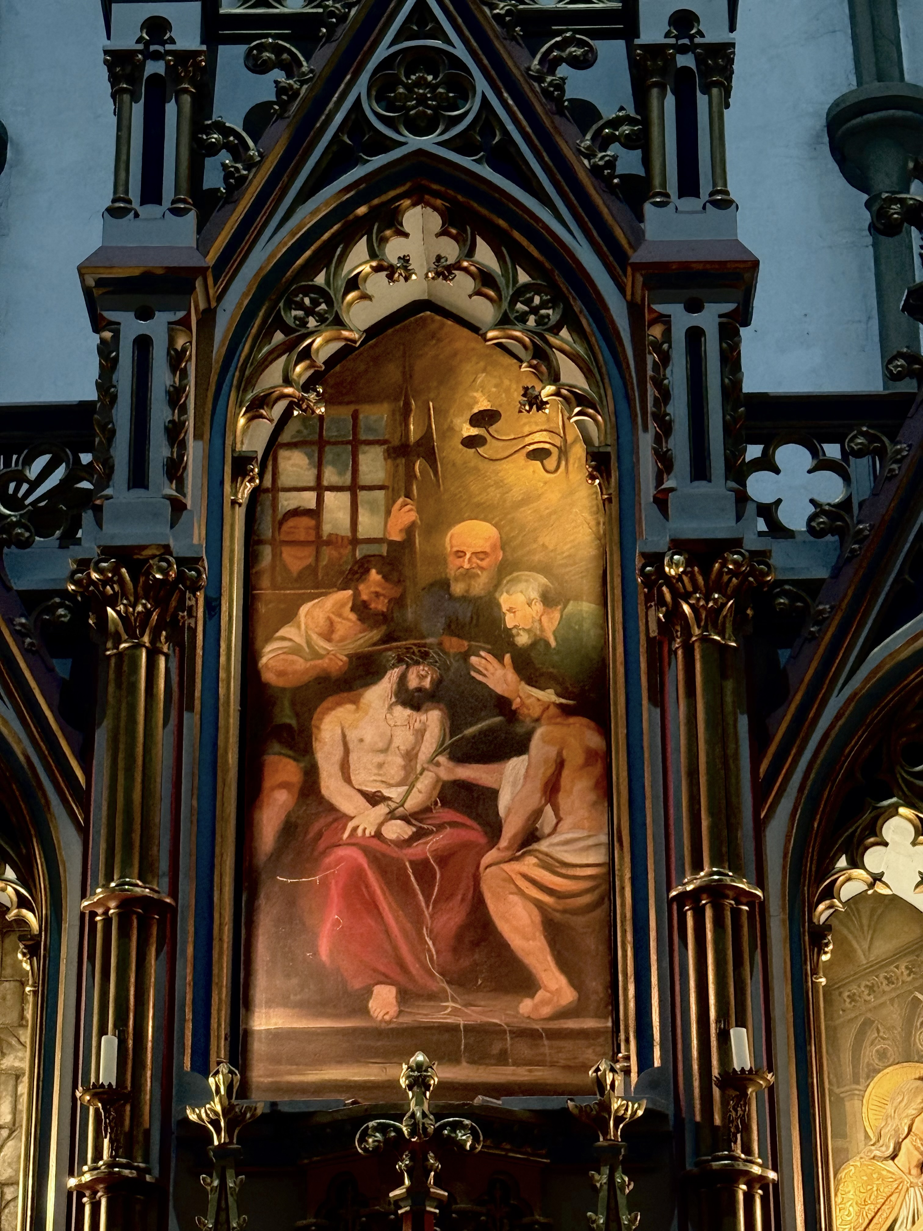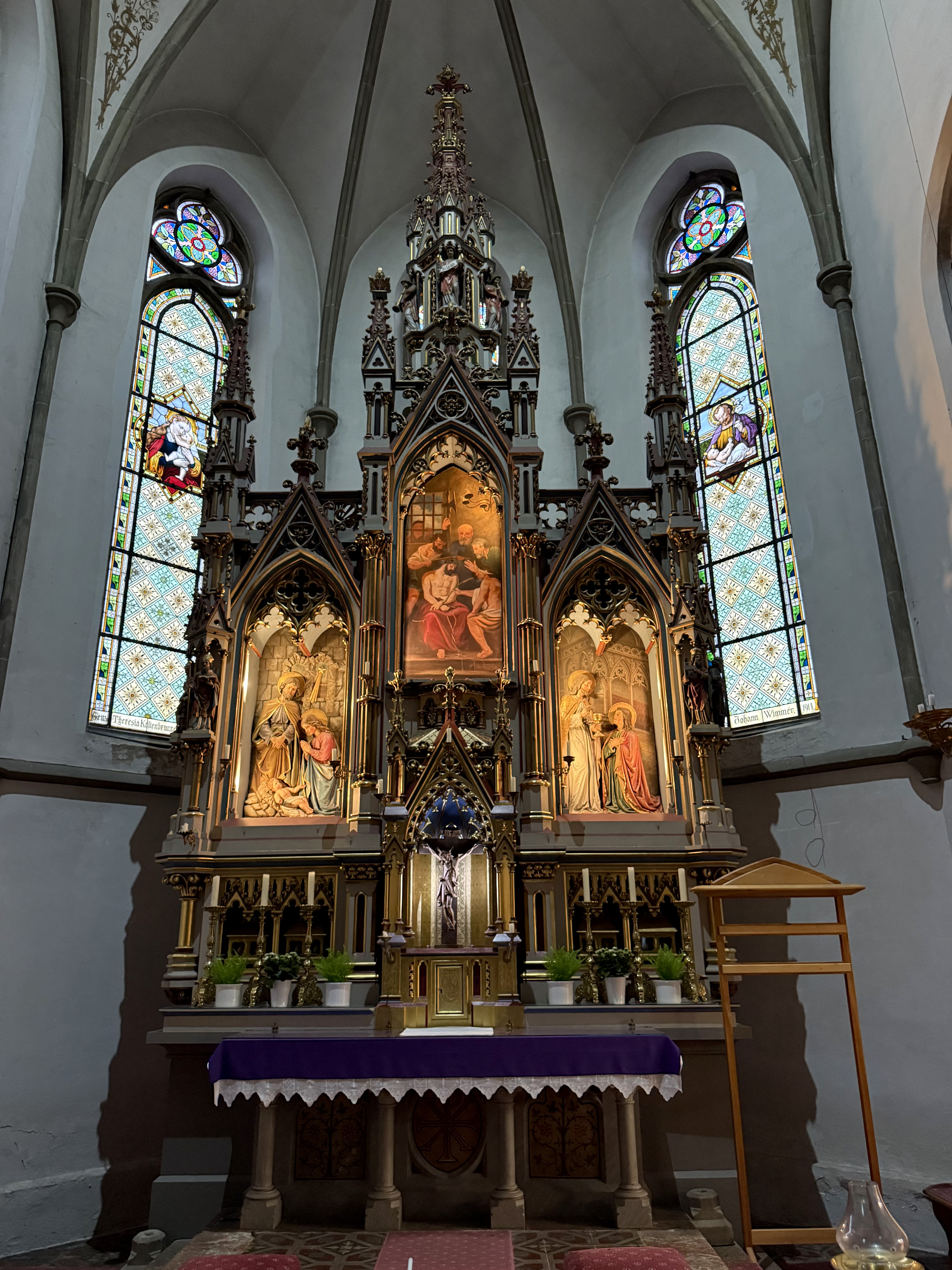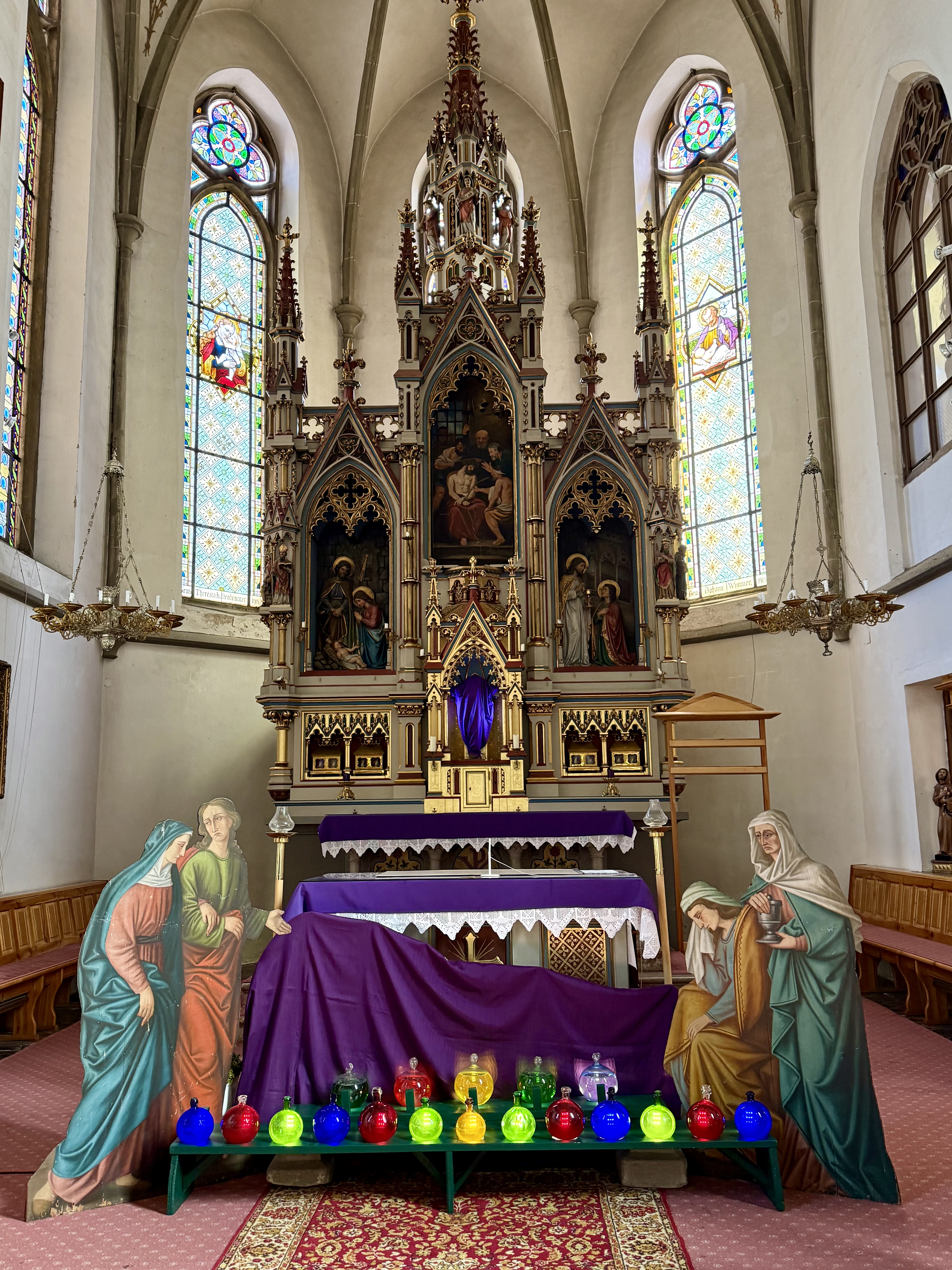 Mit dem Passionssontag werden die Kreuze in unserer Herz Jesu Kirche verhüllt und im Mittelschrein des Hochaltares wird das historische "Ecce-Homo Bild" aus unserem Klosterarchiv eingesetzt.