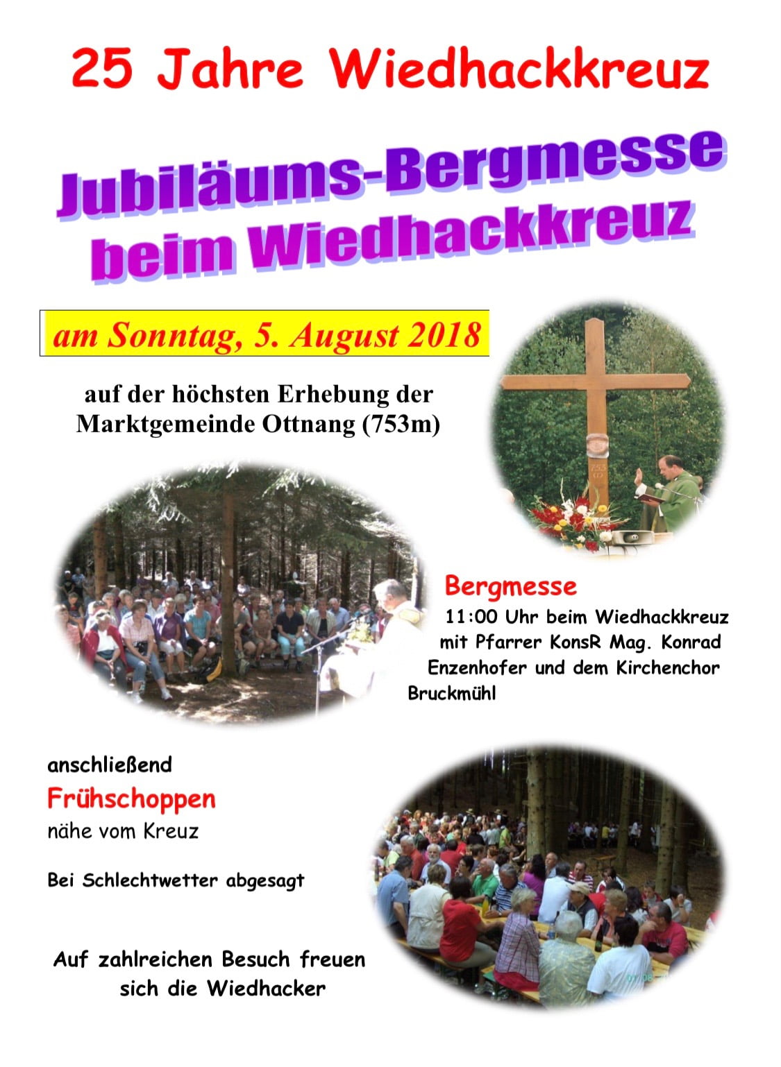 Die Pfarre und der Wiedhackverein luden am Sonntag, 5. 8. 2018 zur Mitfeier der Jubiläums-Bergmesse am Wiedhackgipfel (753m) ein. Vor genau 25 Jahren fand diese Bergmesse des Bruckmühler Brauchtumsvereins das erste Mal statt. Pfarrer Konrad Enzenhofer feierte die Heilige Messe mit den zahlreichen Teilnehmern, die auch aus umliegenden Pfarren gekommen waren. Eine Abordnung des Kirchenchores Bruckmühl gestaltete den Gottesdienst mit der Deutschen Messe von Schubert und auch die Gottesdienstbesucher wurden zum kräftigen Mitsingen eingeladen.