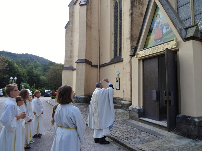 Pfarrer Konrad Enzenhofer segnete am Ende des Festgottesdienstes das neu gemalte Notburga-Bild über dem Seiteneingang der Kirche, das von den Goldhaubenfrauen finanziert wurde.