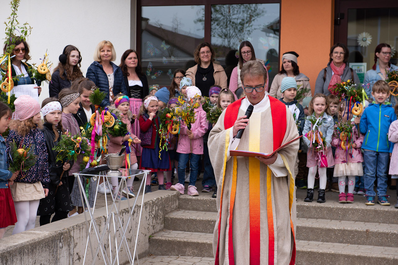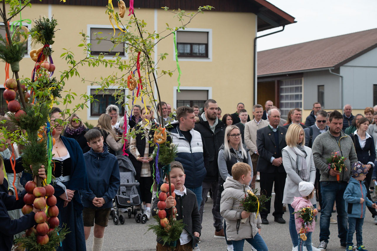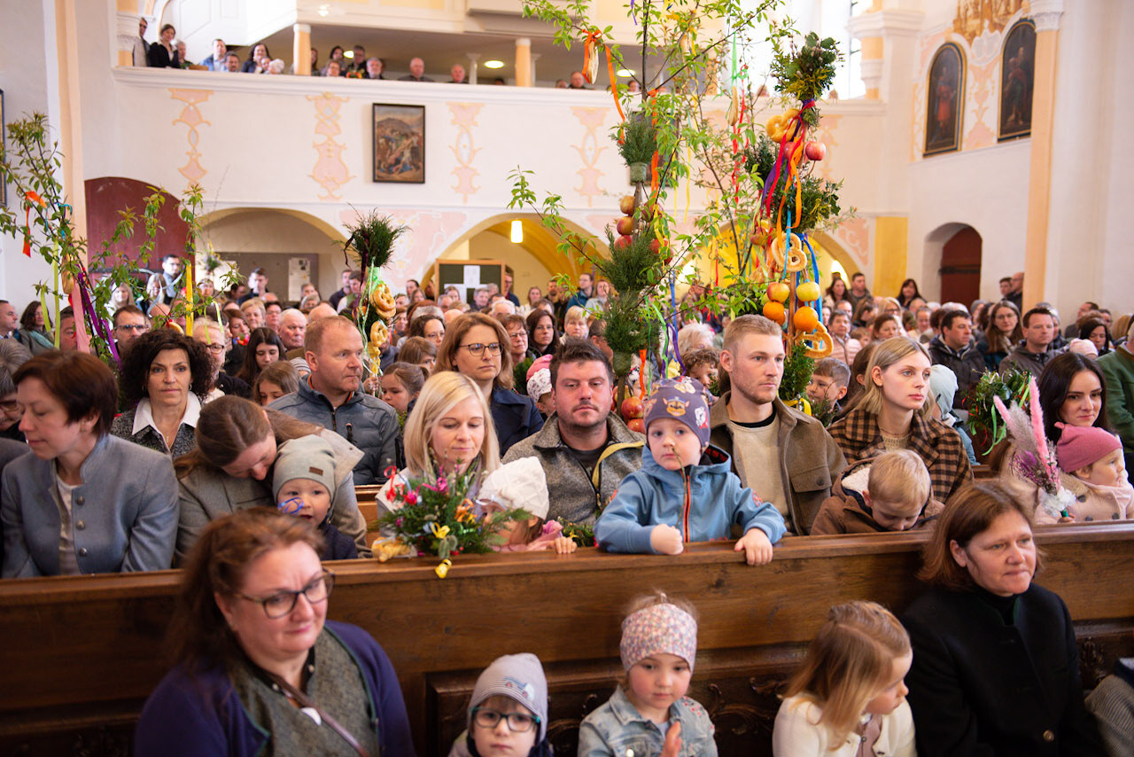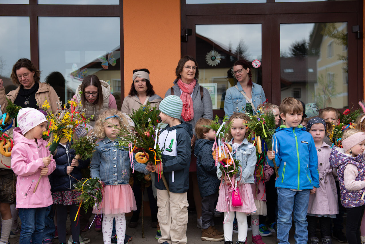 Pfarrer Mag. Gert Smetanig segnete die Palmbäume/Palmbuschen vor der Volksschule.