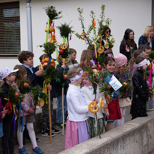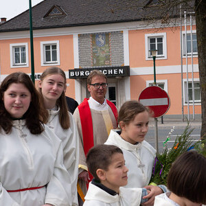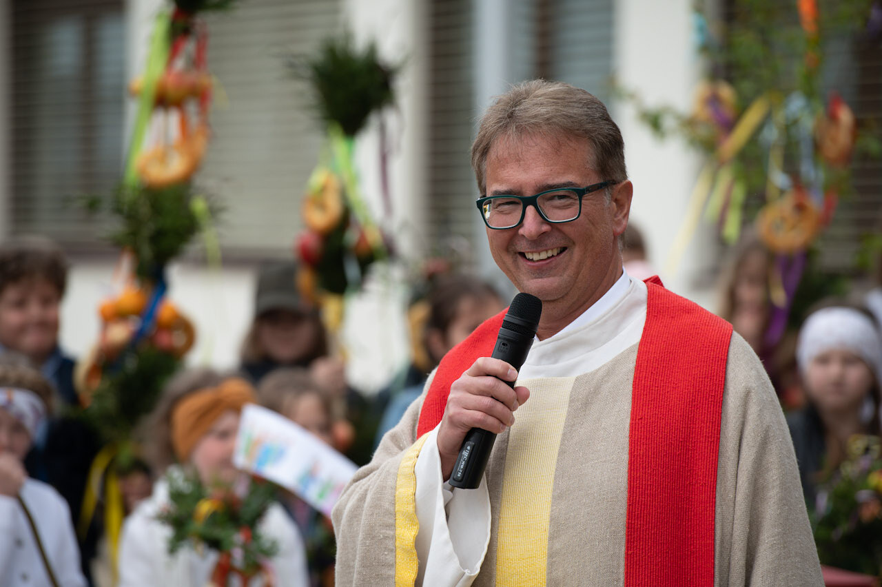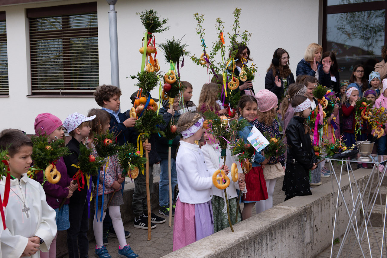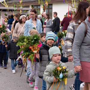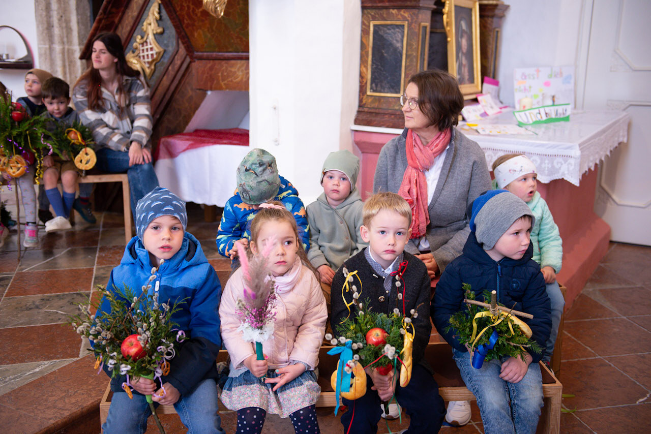 Pfarrer Mag. Gert Smetanig segnete die Palmbäume/Palmbuschen vor der Volksschule.