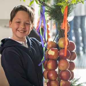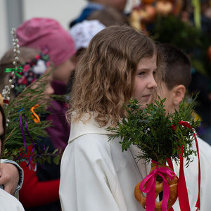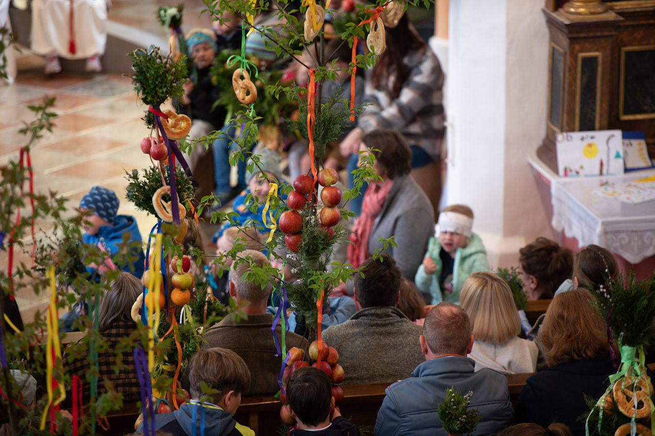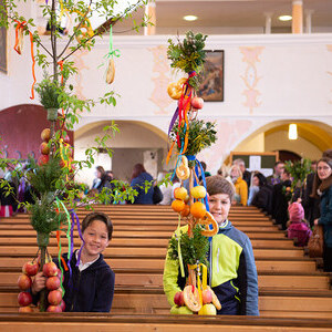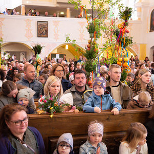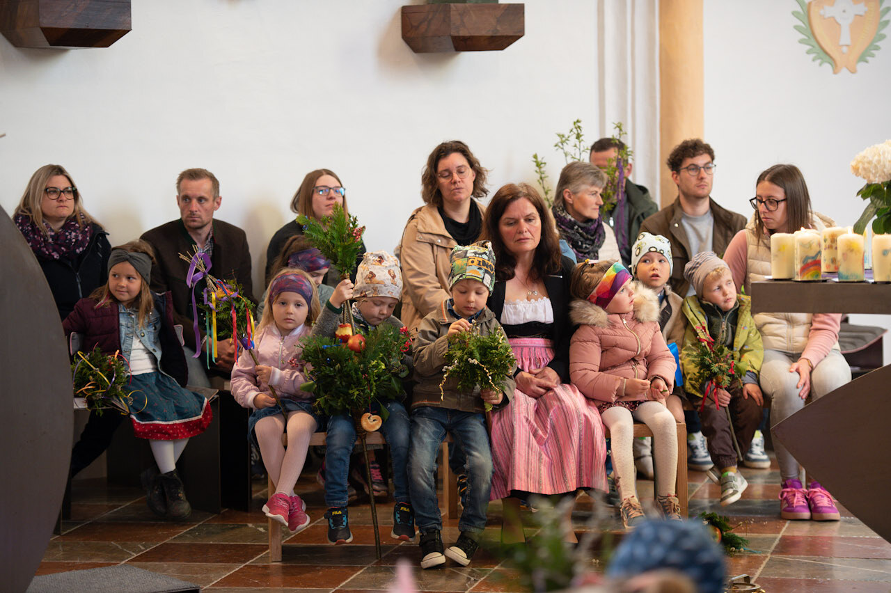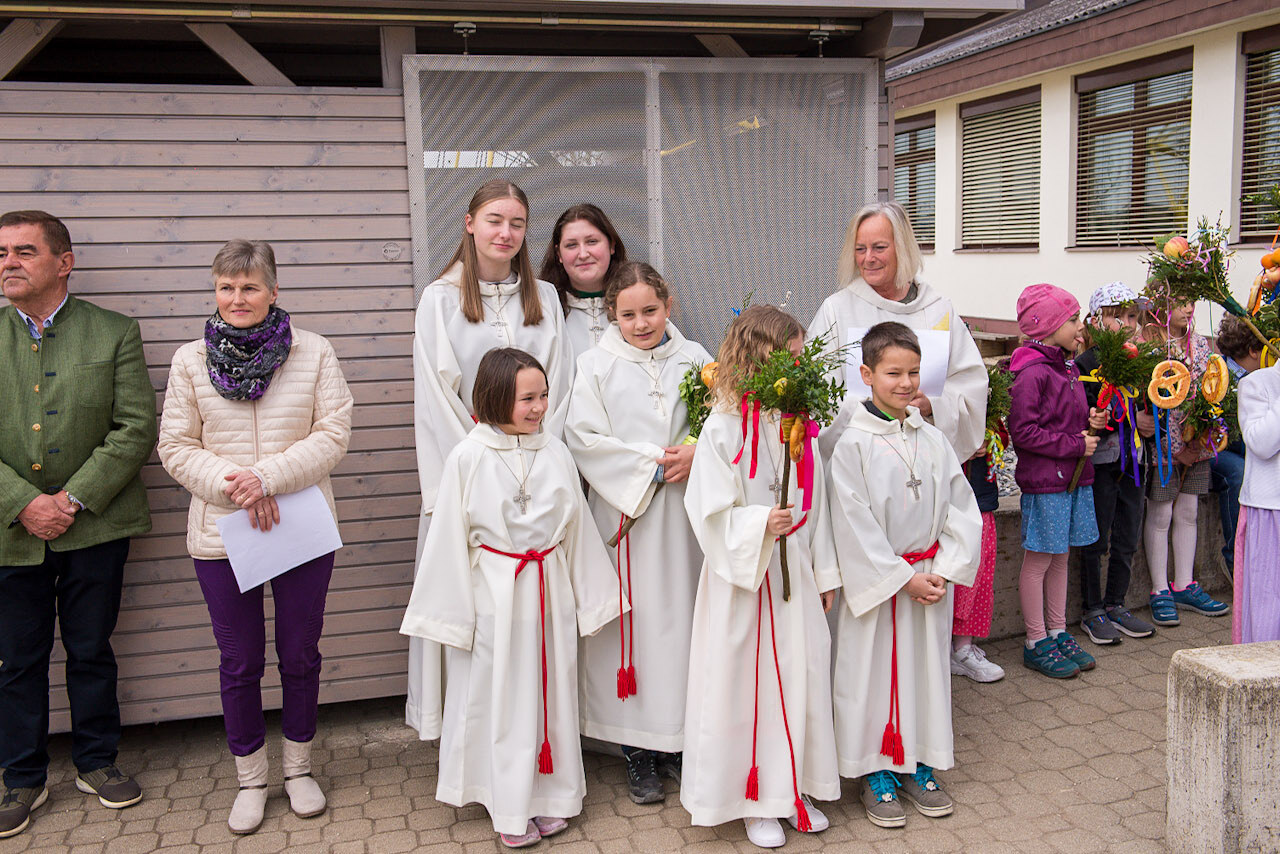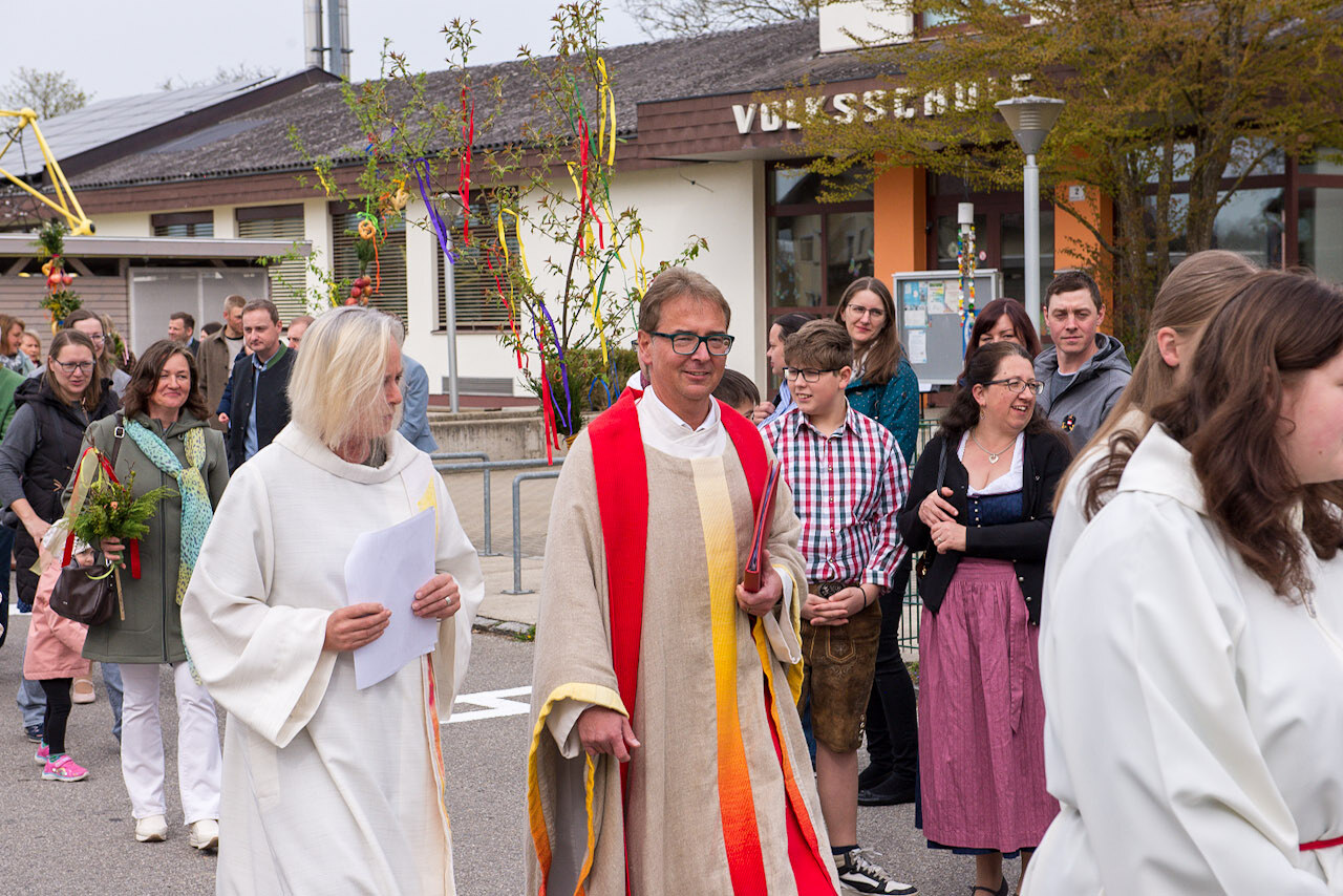Pfarrer Mag. Gert Smetanig segnete die Palmbäume/Palmbuschen vor der Volksschule.
