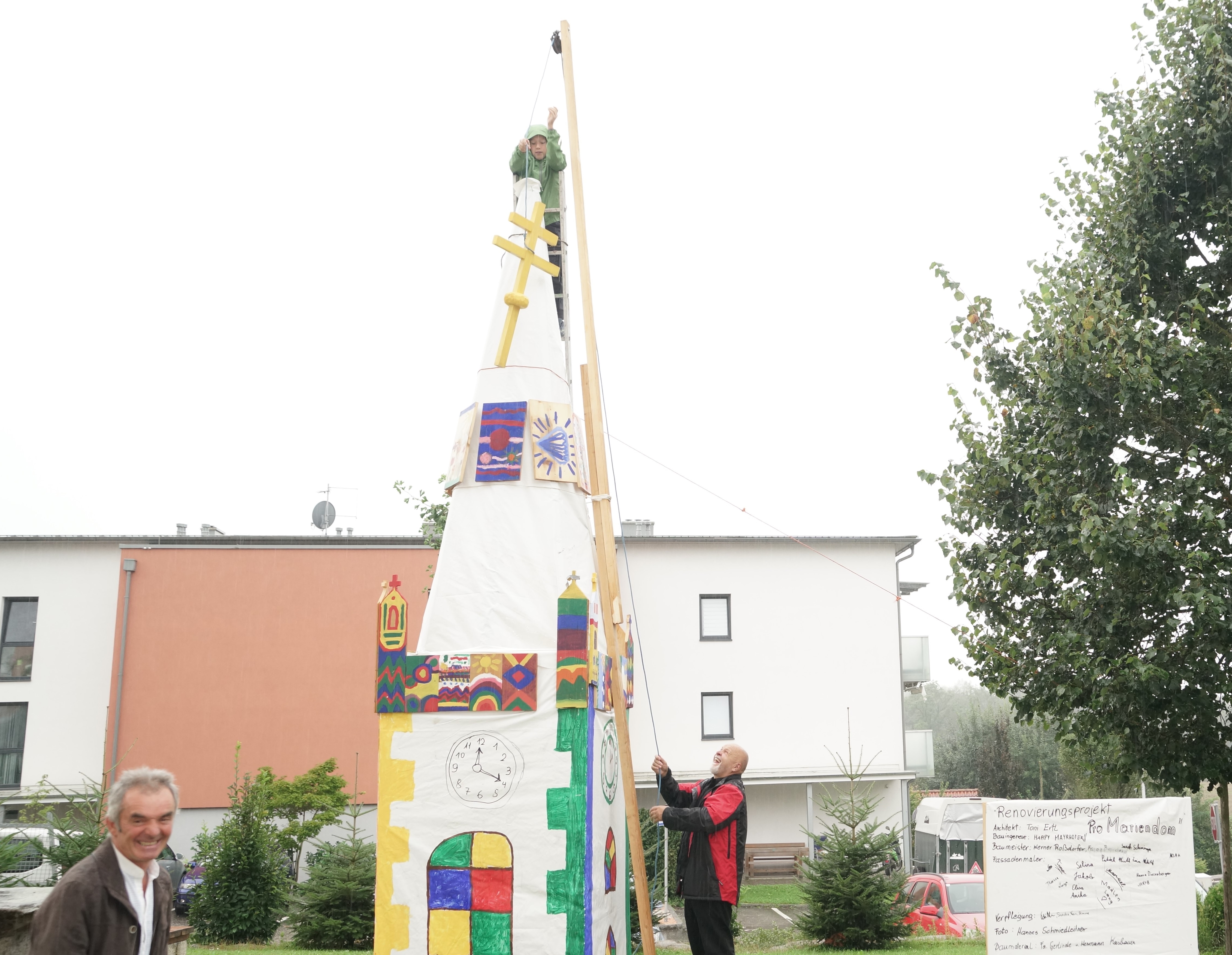 Am Sonntag nach dem Gottesdienst wurde das Turmkreuz von Noah Diesenberger aufgesteckt. Noah hat sich schon beim Bau des Mariendoms als guter Zimmermann und Kletterer einen Namen gemacht und wurde deshalb für die Turmkreuzsteckung auserwählt. In den Kindern steckt schon sehr viel malerisches Talent, das sich in den bunten Bildern zeigt.