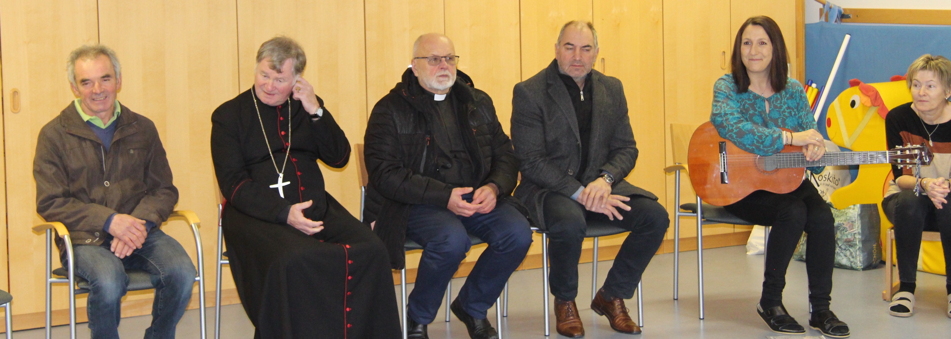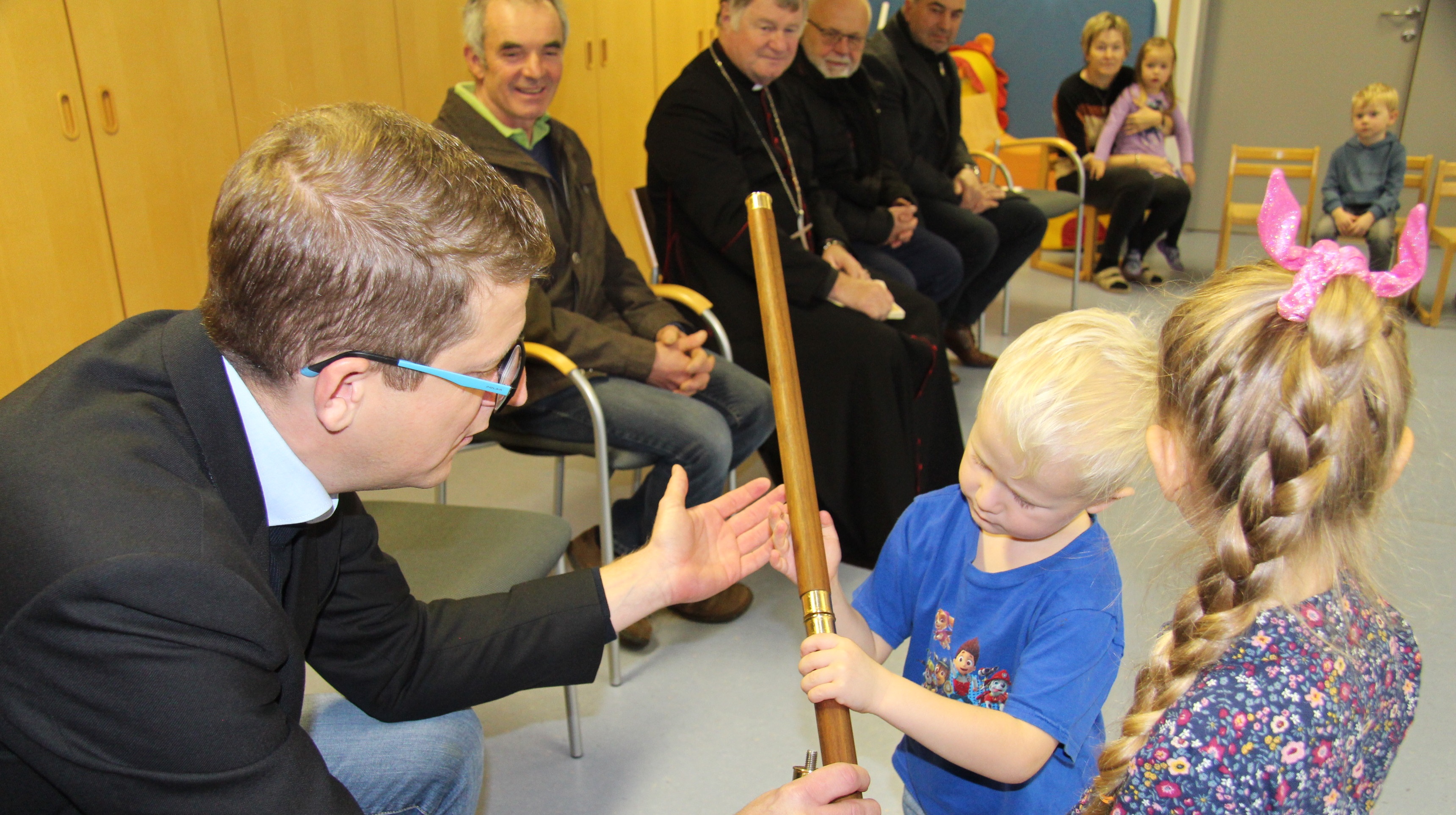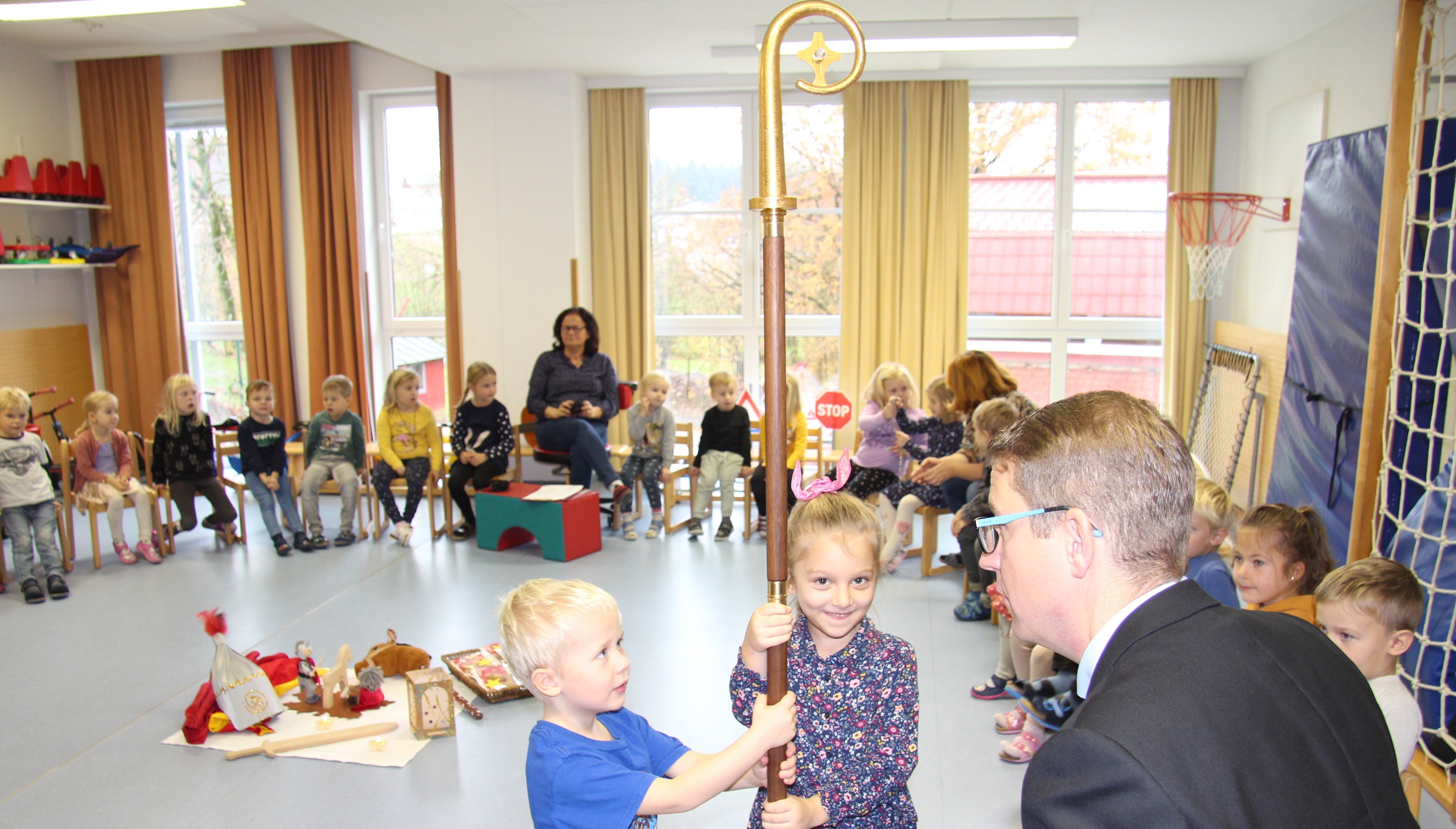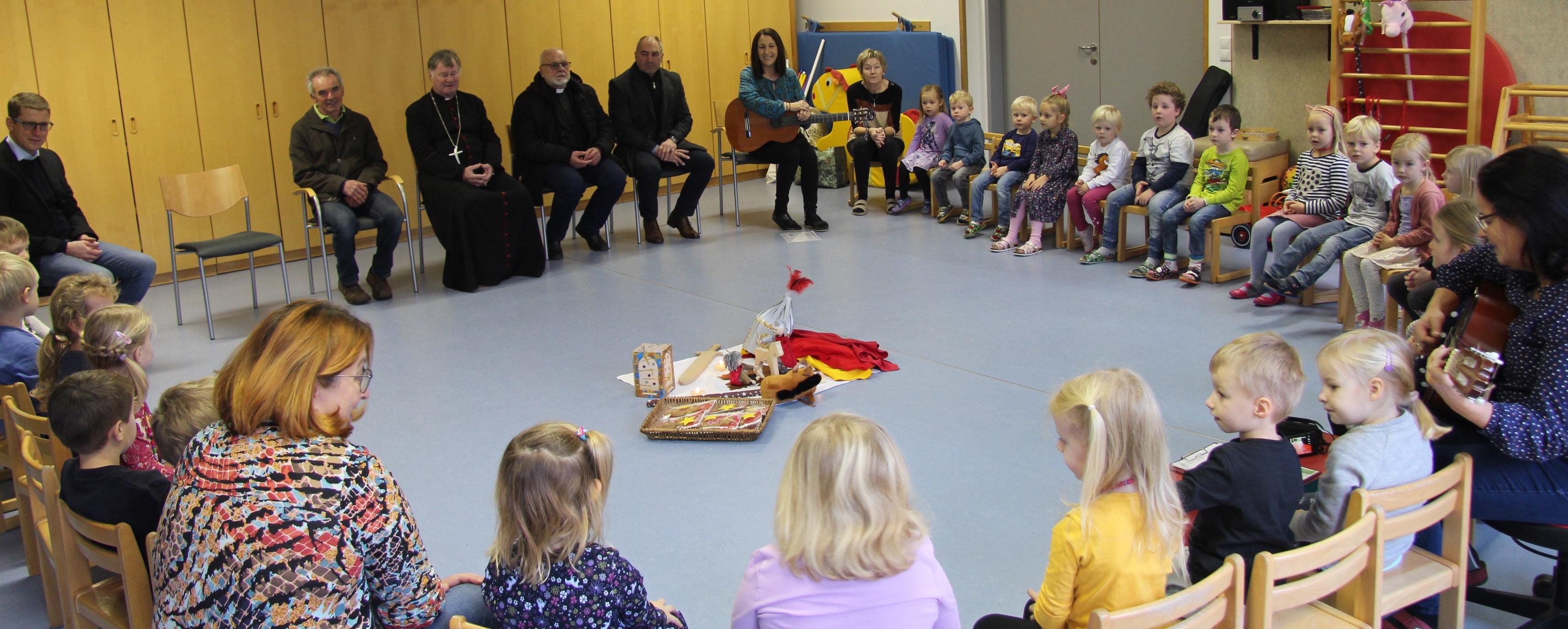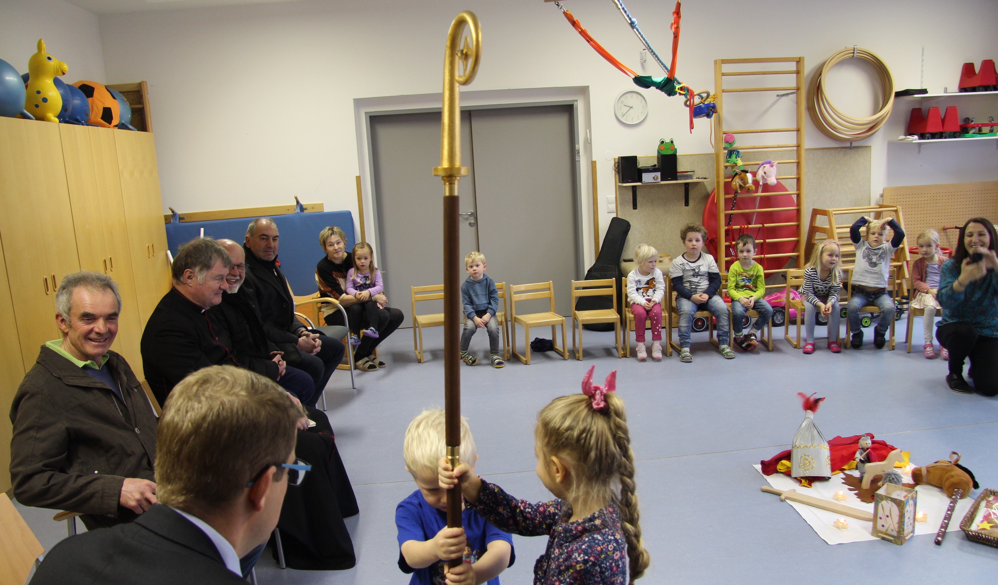 ... begrüßten wir unseren Bischof mit einem Willkommenslied. Nachdem er sich vorgestellt und uns die wichtigsten Utensilien eines Bischofs gezeigt hatte, segnete er die Kinder . Natürlich durfte auch jedes Kindergartenkind den Bischofssegen empfangen. Bischof Manfred wird uns als sehr zugänglich, interessiert und volksnah in Erinnerung bleiben!