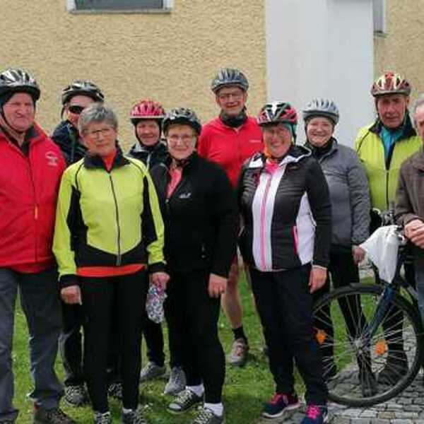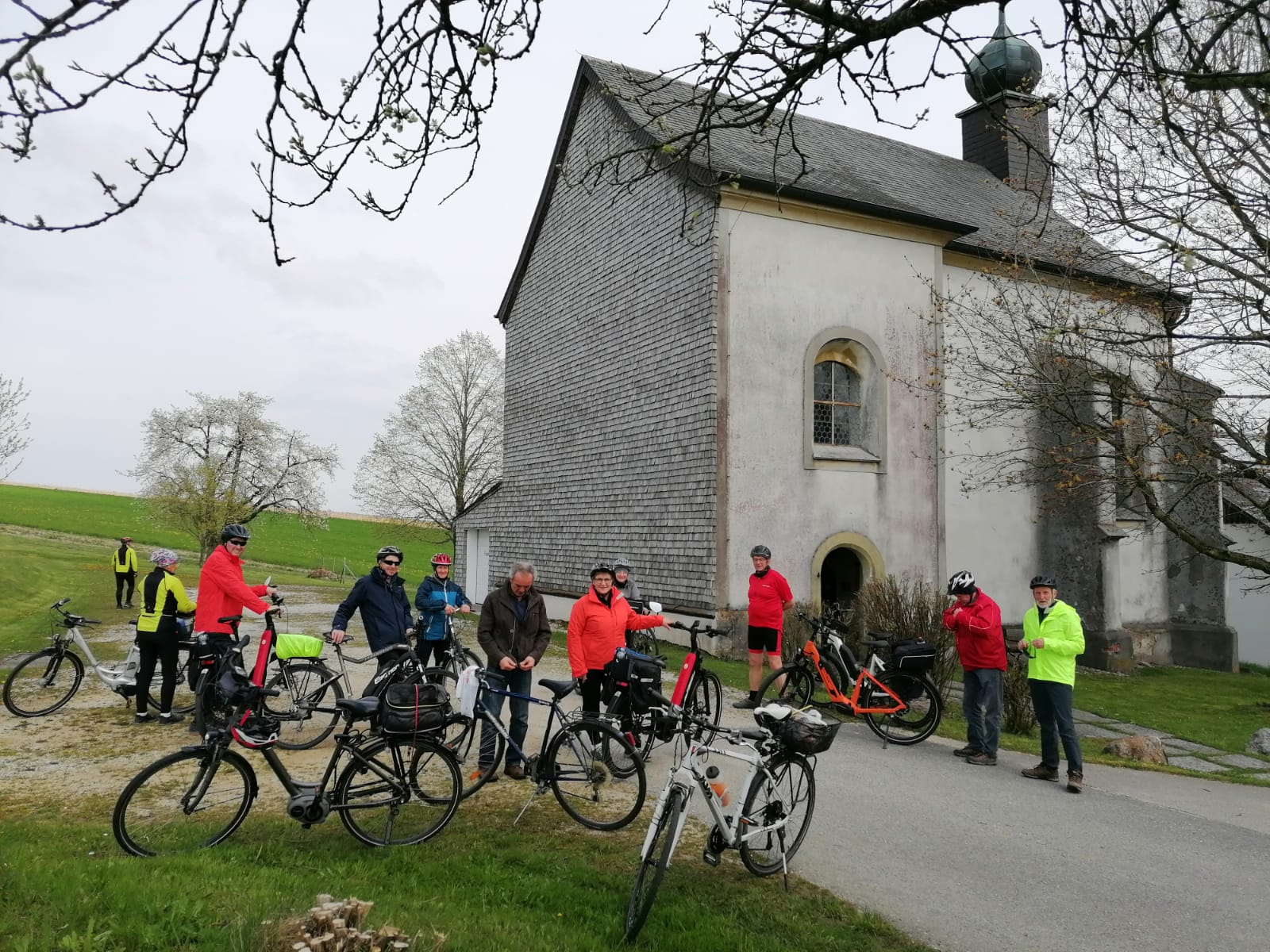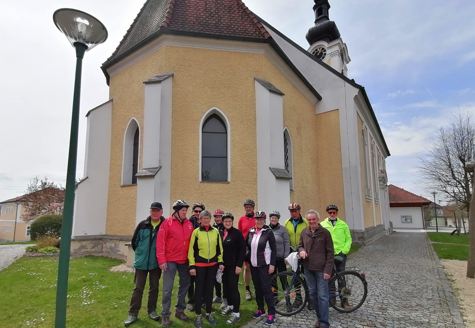 Gruppenfoto vor der Pfarrkirche in Dorf an der Pram. Ziel war die Filialkirche St. Nikolai Pfarre Pram. Es war eine schöne Tour.