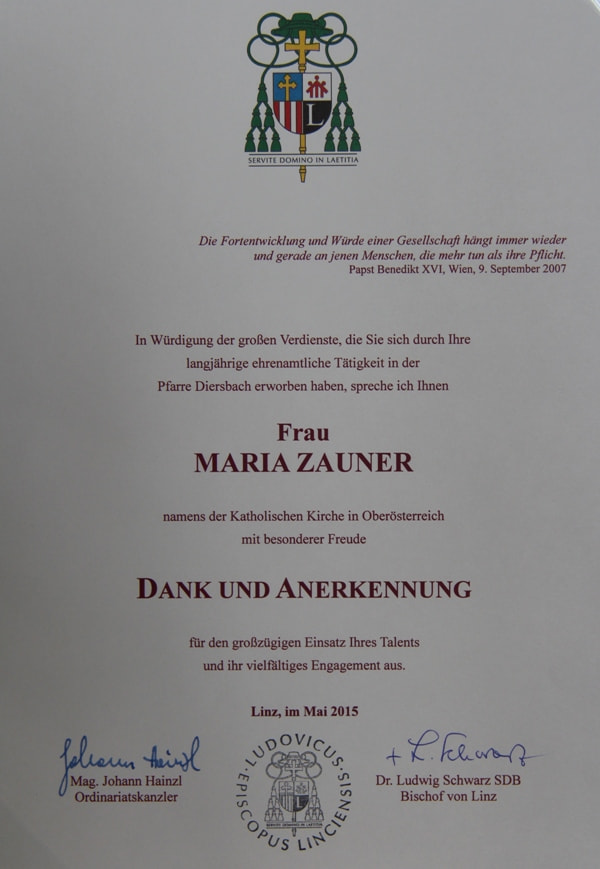 In Würdigung der großen Verdienste, die Sie sich unsere Maria durch Ihre langjährige ehrenamtliche Tätigkeit in der Pfarre Diersbach