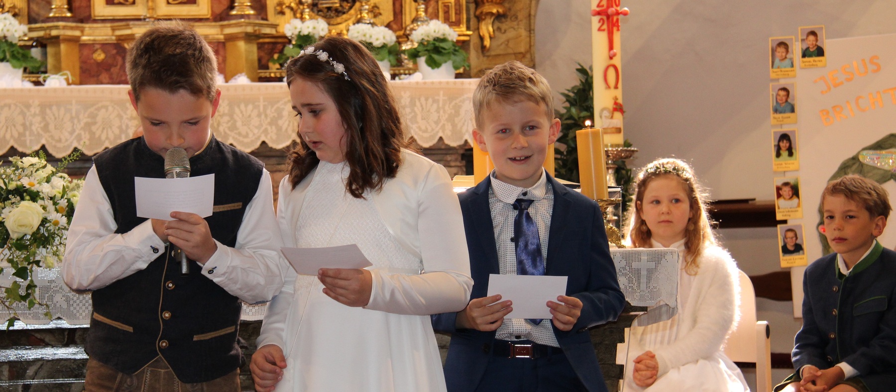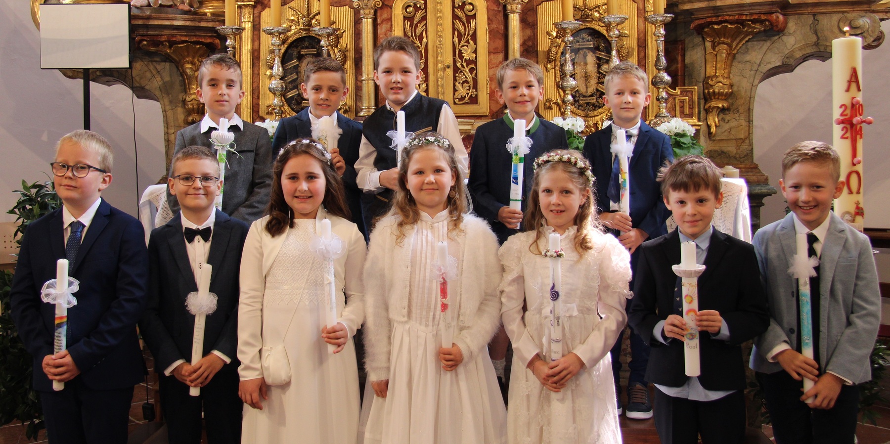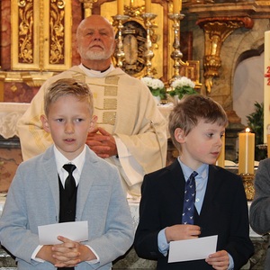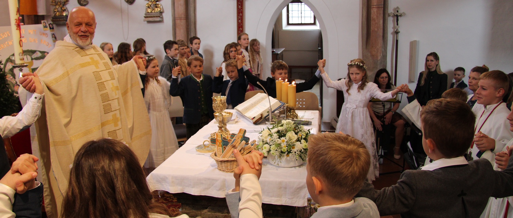 Unter feierlichem Glockengeläut zogen die 12 Kinder mit Pfarrer Thaddäus Kret, Religionslehrerin Maria und ihren Eltern in die festlich geschmückte Pfarrkirche St. Martin ein, um zum ersten Mal das Brot des Lebens zu empfangen. Musikalisch begleitet wurde der Gottesdienst vom Kinderchor .