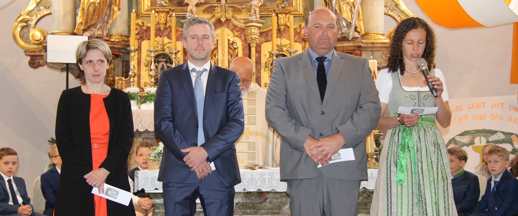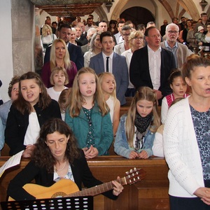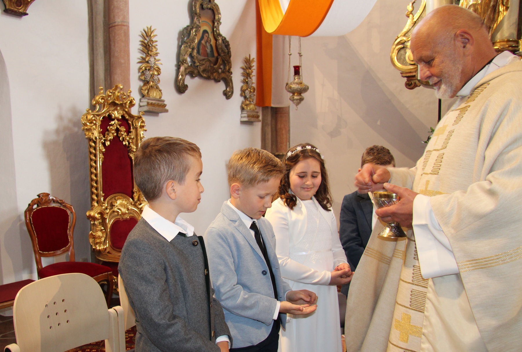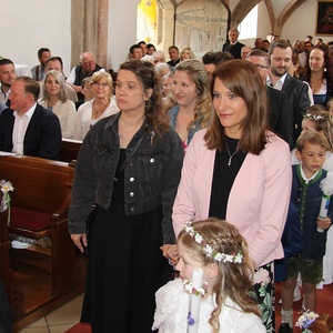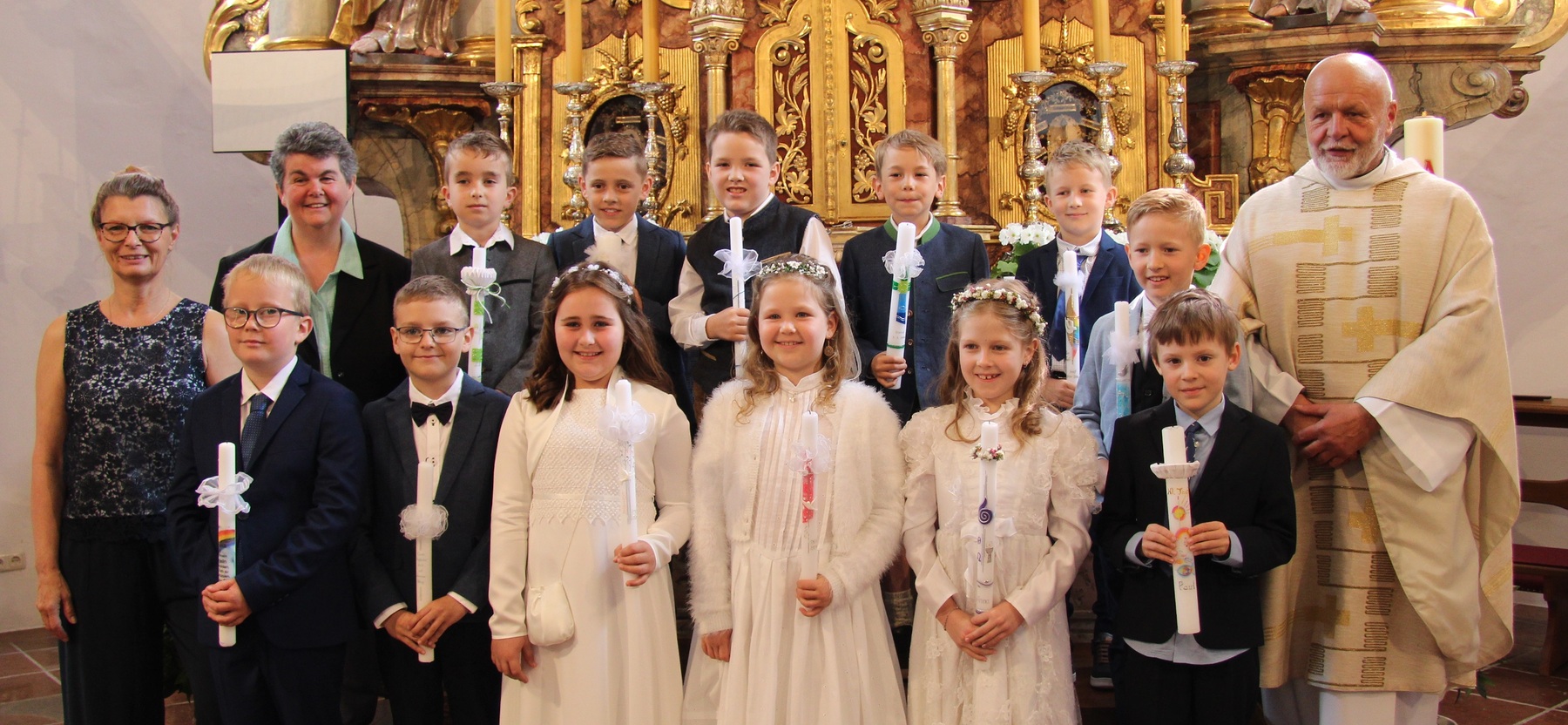 Unter feierlichem Glockengeläut zogen die 12 Kinder mit Pfarrer Thaddäus Kret, Religionslehrerin Maria und ihren Eltern in die festlich geschmückte Pfarrkirche St. Martin ein, um zum ersten Mal das Brot des Lebens zu empfangen. Musikalisch begleitet wurde der Gottesdienst vom Kinderchor .
