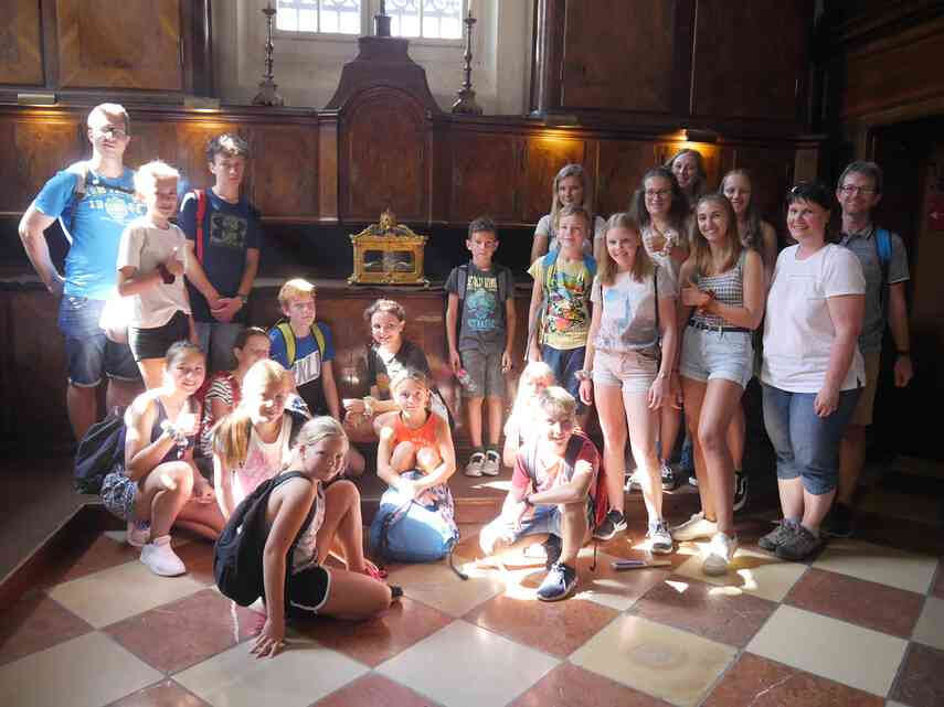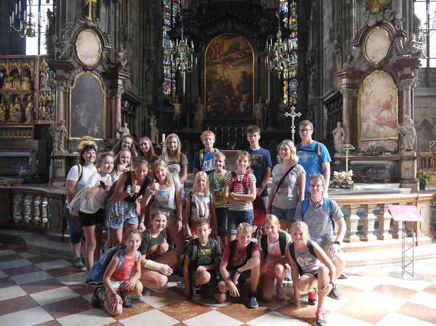 In Wien angekommen schlängelten wir uns durch Menschenmassen in den U-Bahnstationen und waren froh, als wir alle gemeinsam im Zentrum angekommen waren. Dort ging es zu Time Travel - ein besonderes actionreiches Museum, in dem die Geschichte Wiens erlebbar gemacht wird. Nach der Wohlverdienten Mittagspause bekamen wir dann eine Spezialführung im Stephansdom, die von Frau Chwatal im Auftrag der Dompfarre extra für die Dietacher Ministranten gestaltet wurde. Wir durften in beide Sakristeien und sahen die Reliquien des Hl. Stephanus sowie des Hl. Stephan von Ungarn, die nur einmal im Jahr zu sehen sind. Außerdem waren wir in den Katakomben, die uns ein wenig Abkühlung verschafften. Nach einem Abschluss-Eis ging es wieder zum Bahnhof und retour nach St. Valentin bzw. Dietach.