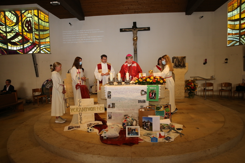 Aufgrund der Beschränkungen konnten in der Kirche nur die Hälfte der Sitzplätze besetzt werden. Daher wurde die Firmung live (in Wort und Bild) ins KUBEZ übertragen, sodass alle, die mitfeiern wollten, das auch tun konnten.