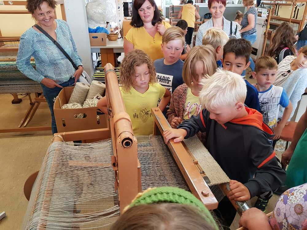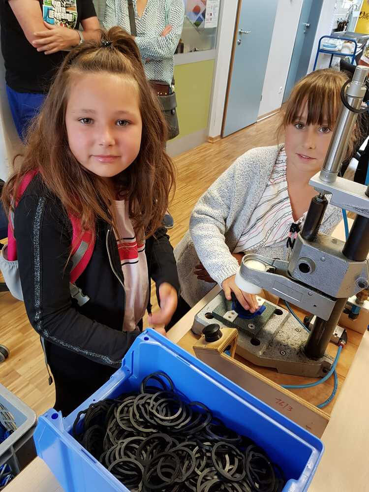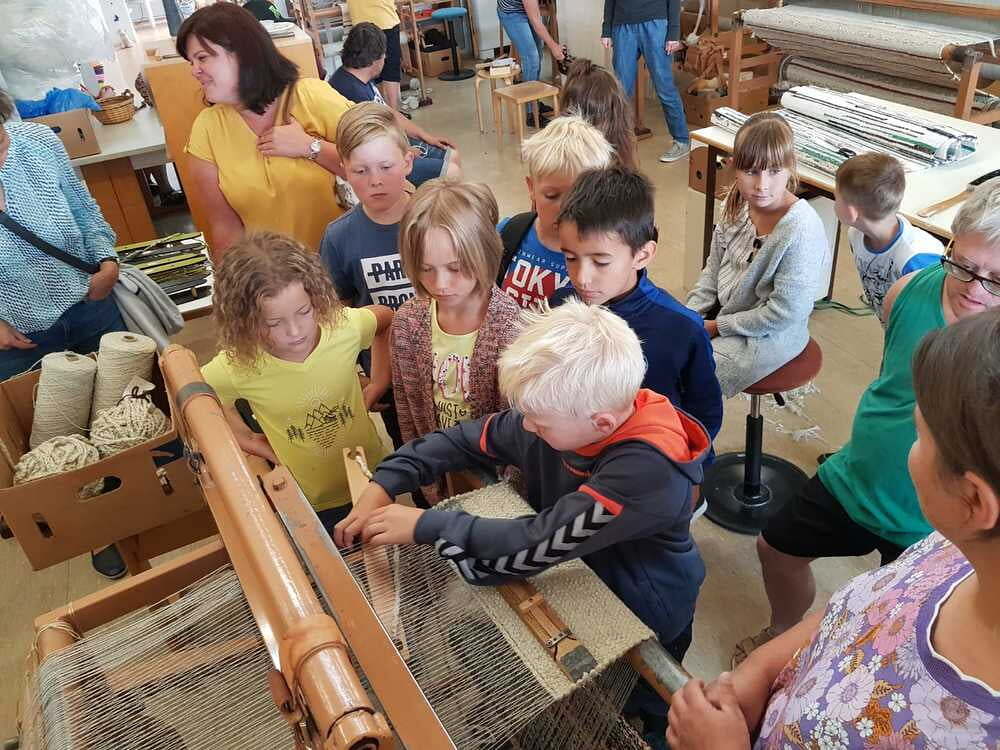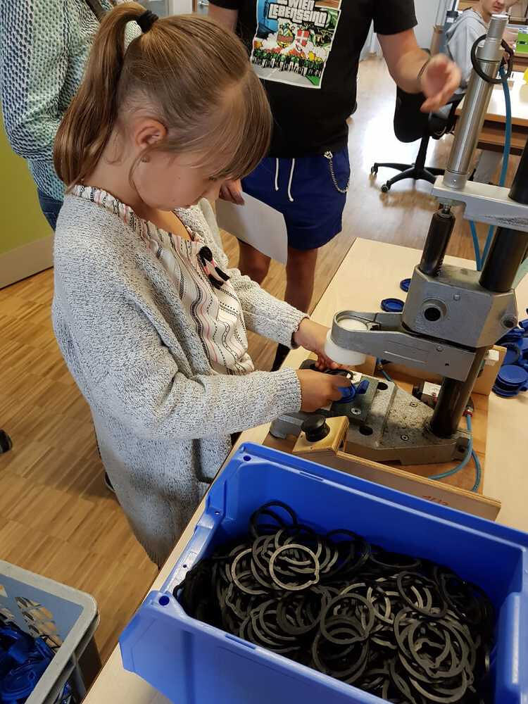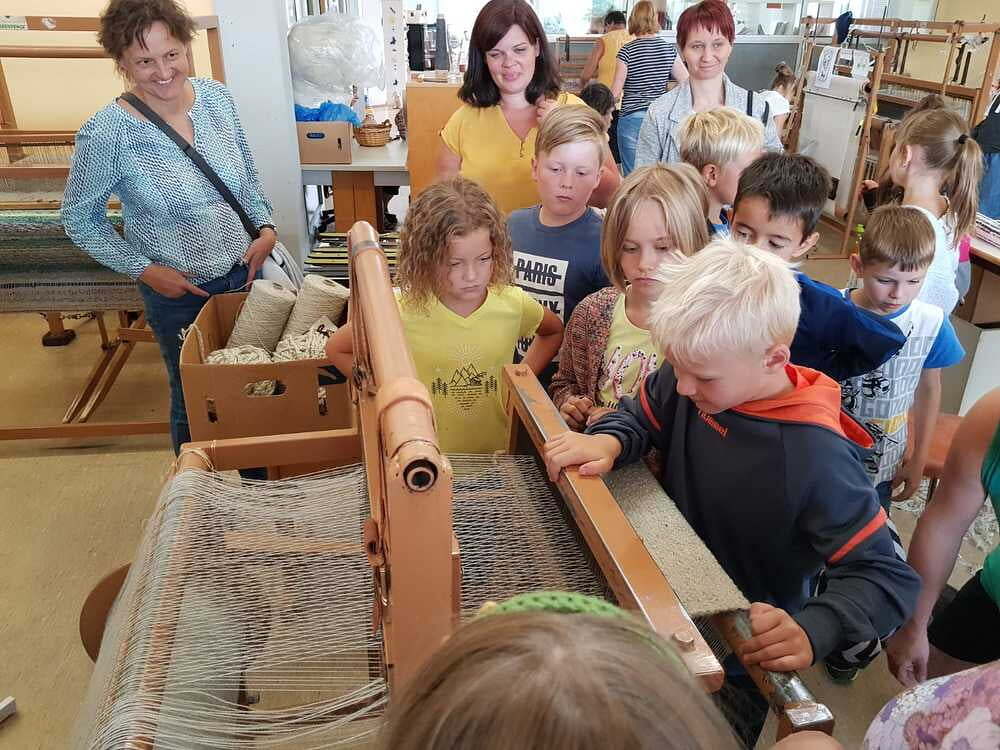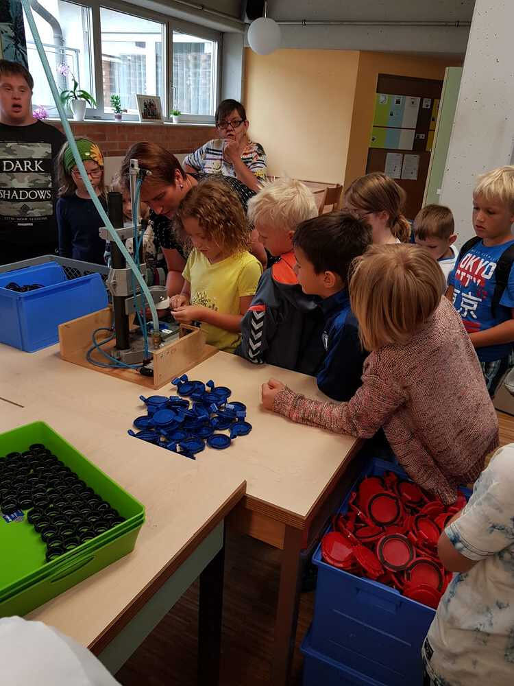 Dort wurden wir sehr freundlich empfangen und uns wurde vom Wohnen und Arbeiten in St. Pius berichtet. Ein junger Mann, namens Bibi führte uns nach den vielen Informationen der Hausleitung durch die Wohnanlage und Werkstätte. Da wurde es sodann richtig interessant für uns. Wir durften den Menschen mit Beeinträchtigungen nicht nur zuschauen, sondern auch selber Hand anlegen. So versuchten wir an einem Teppich mitzuarbeiten. Dazu braucht man unheimlich viel Kraft und Ausdauer. Wir haben Dichtungsgummis in Steckdosen eingedrückt und festgestellt, dass viel Konzentration notwendig ist, um nichts verkehrt zu machen. Sehr interessant war auch, dass unsere Tintenpatronen, die wir in der Schule verwenden, zum Teil auch in St. Pius eingepackt werden.