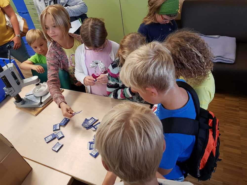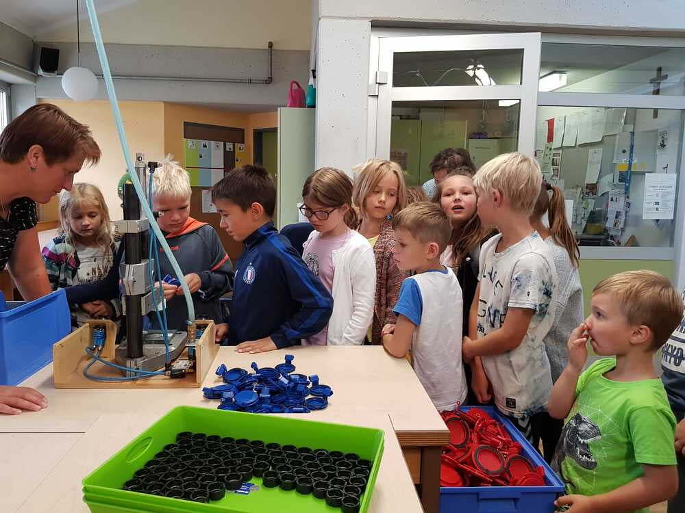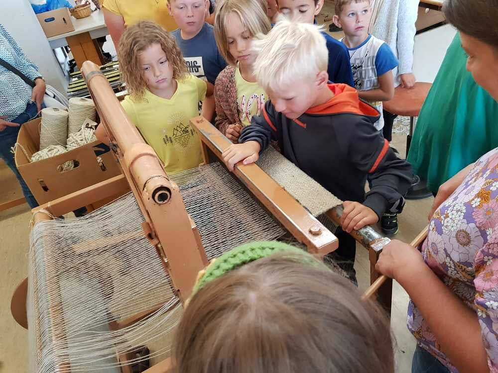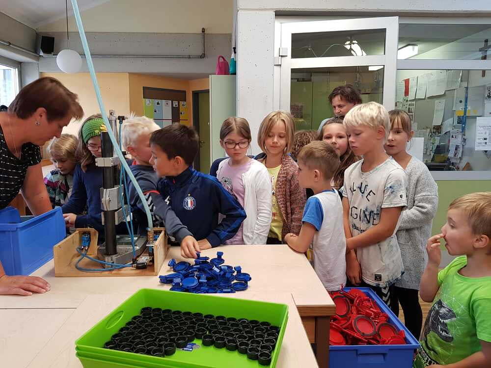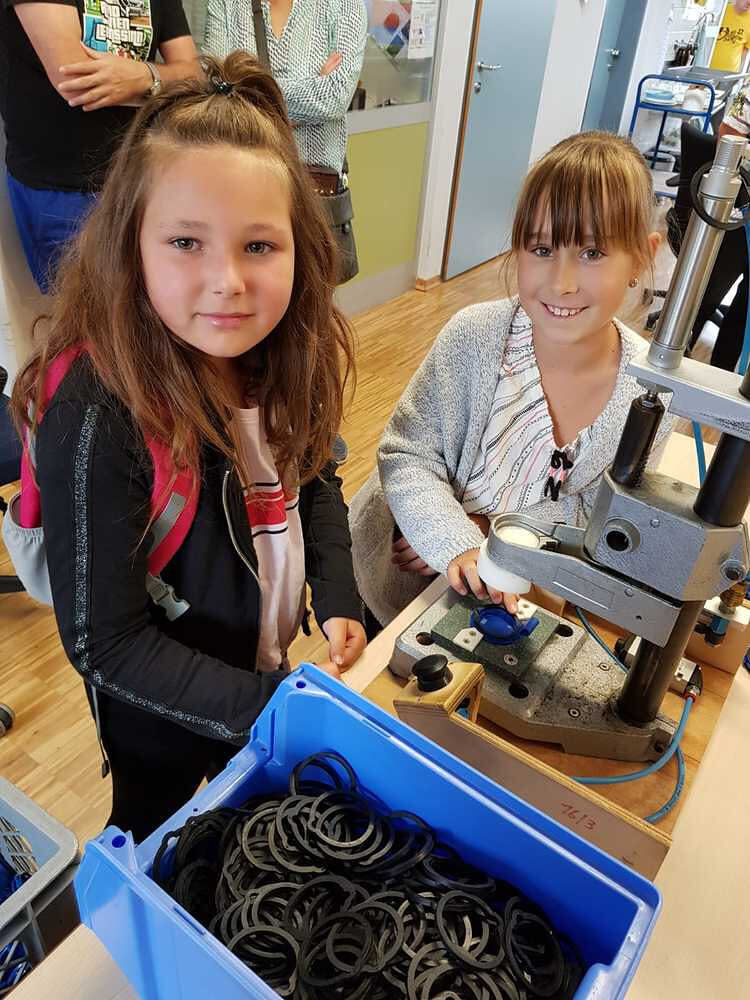 Dort wurden wir sehr freundlich empfangen und uns wurde vom Wohnen und Arbeiten in St. Pius berichtet. Ein junger Mann, namens Bibi führte uns nach den vielen Informationen der Hausleitung durch die Wohnanlage und Werkstätte. Da wurde es sodann richtig interessant für uns. Wir durften den Menschen mit Beeinträchtigungen nicht nur zuschauen, sondern auch selber Hand anlegen. So versuchten wir an einem Teppich mitzuarbeiten. Dazu braucht man unheimlich viel Kraft und Ausdauer. Wir haben Dichtungsgummis in Steckdosen eingedrückt und festgestellt, dass viel Konzentration notwendig ist, um nichts verkehrt zu machen. Sehr interessant war auch, dass unsere Tintenpatronen, die wir in der Schule verwenden, zum Teil auch in St. Pius eingepackt werden.