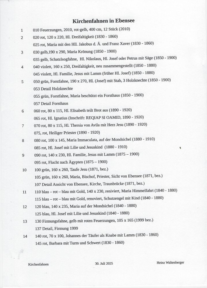 Bei der jährlichen Fronleichnamsprozession werden etwa zehn Fahnen mitgeführt, und sie bleiben anschließend für einige Zeit sichtbar in der Kirche.