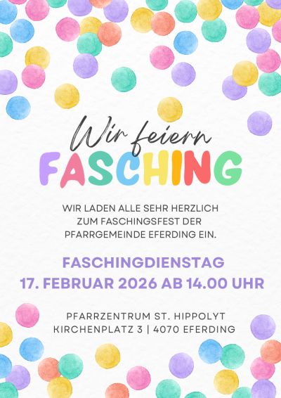 Die Pfarrgemeinde Eferding lädt alle herzliche ein zum Faschingsfest im Pfarrzentrum St. Hippolyt