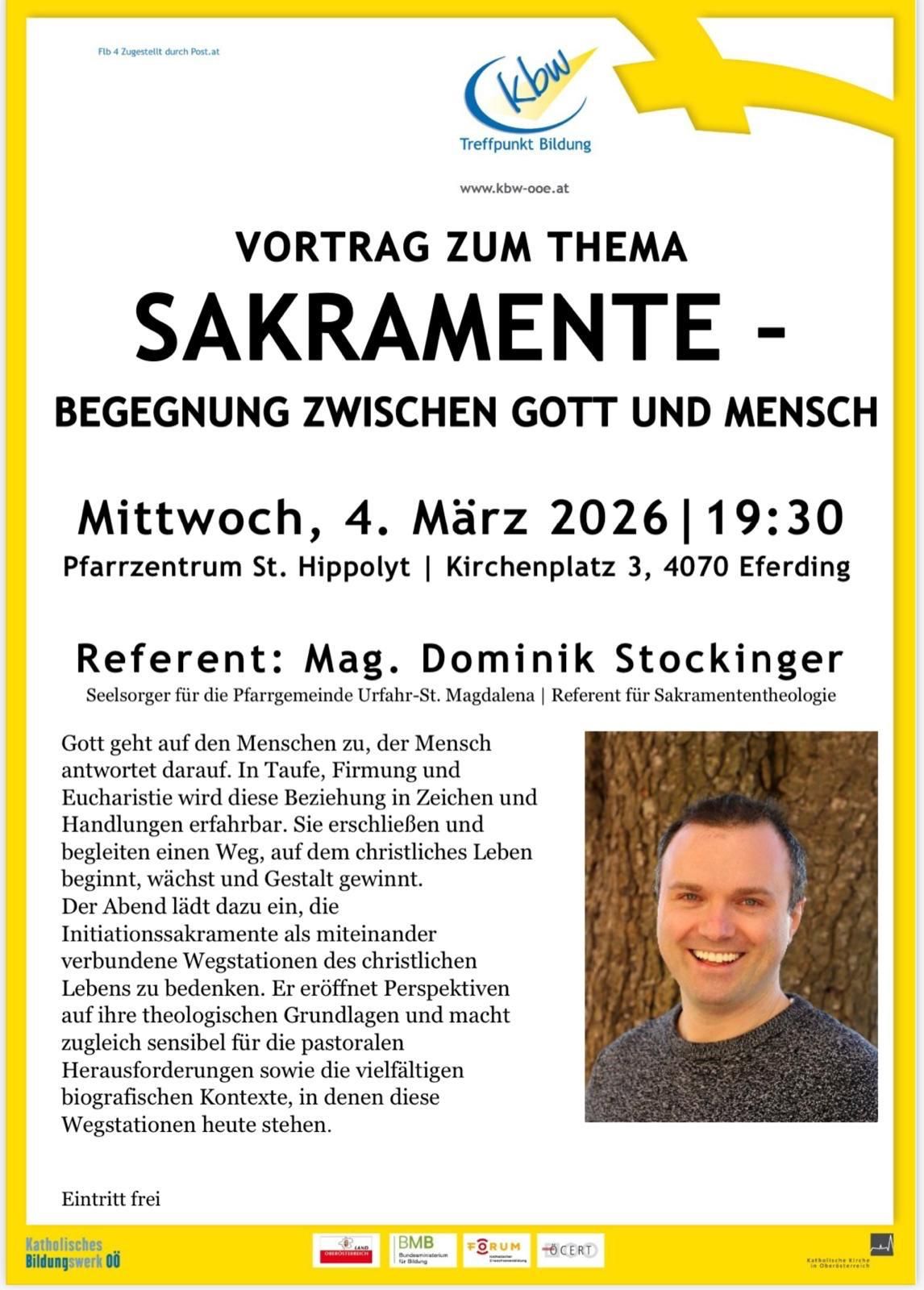 Das Katholische Bildungswerk lädt herzlich ein zum Vortrag über die Sakramente - Referent: Mag. Dominik Stockinger Eintritt frei