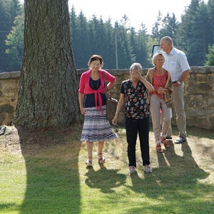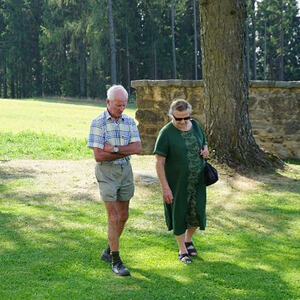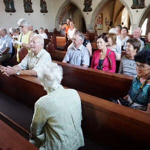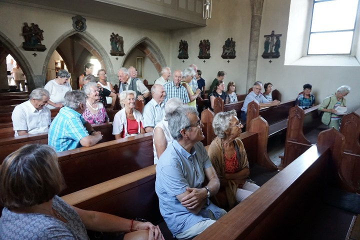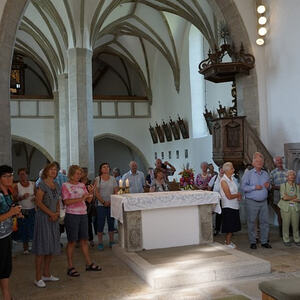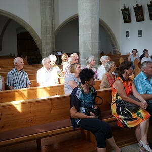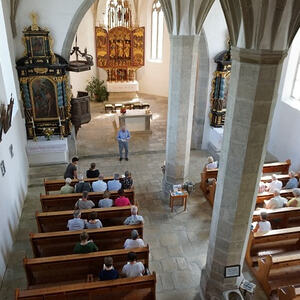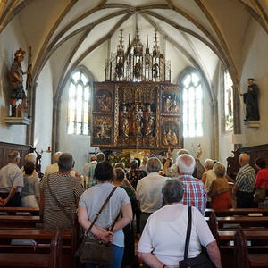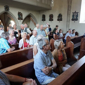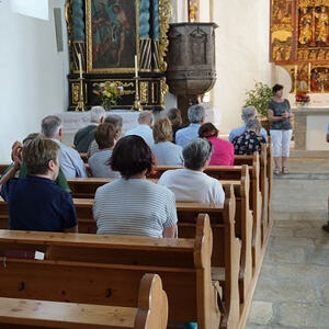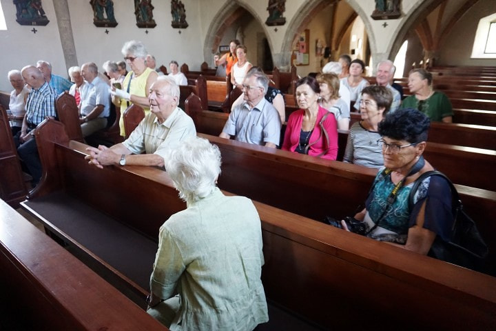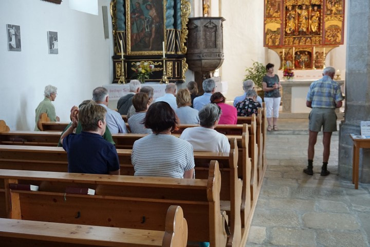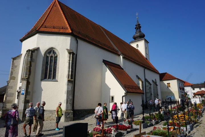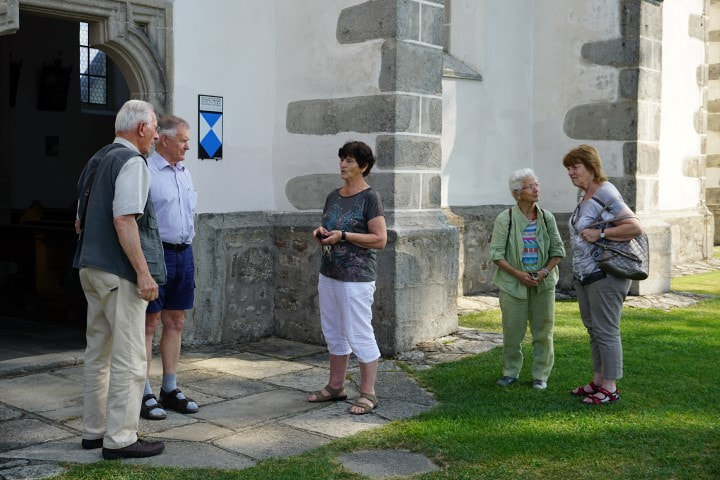 Frau Exl, eine der Mesnerinnen der Kirche, erklärt uns die Geschichte der Kirche, die baulichen Besonderheiten, die Orgel aus dem Jahr 1670 und betont, bezogen auf die Jetztzeit: