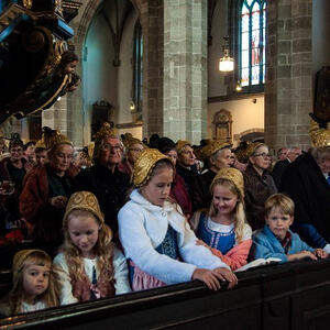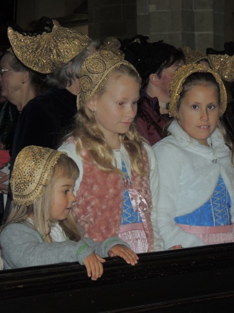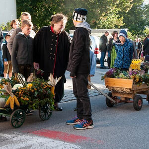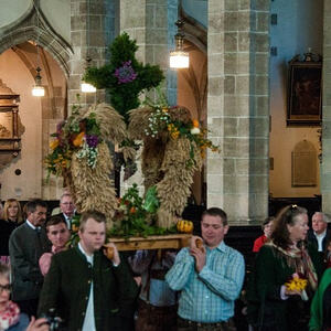 Erstmals wurde die Erntedankkrone nicht getragen, sondern auf einem reich geschmückten Traktoranhänger zur Kirche gefahren. Einige „Nachwuchslandwirte“ waren mit ihren aufgeputzten und schwer beladenen Tret-Traktoren mit dabei.