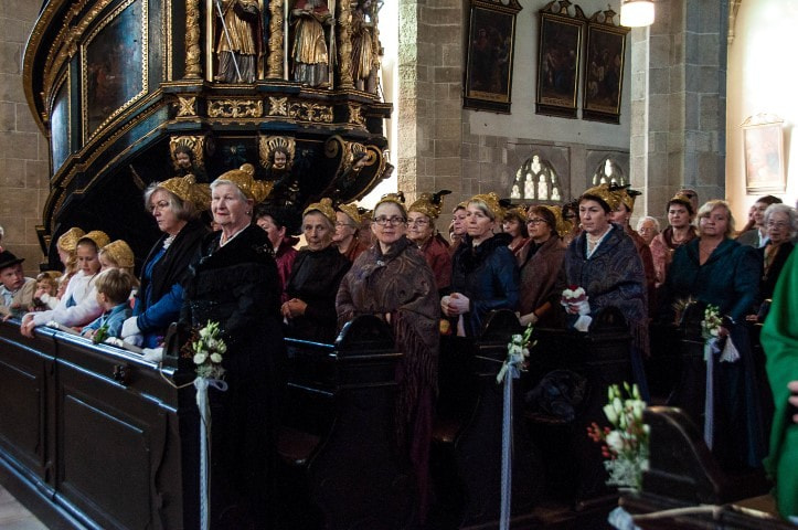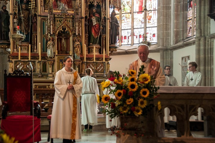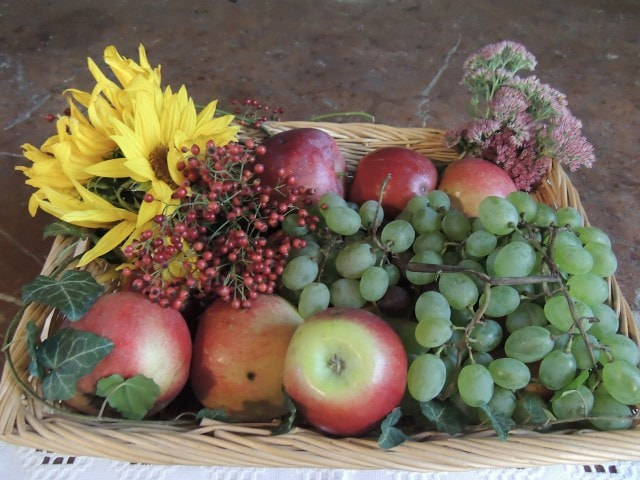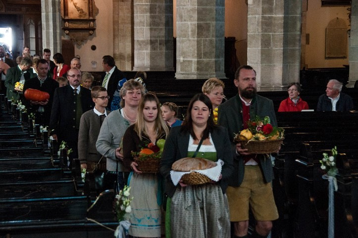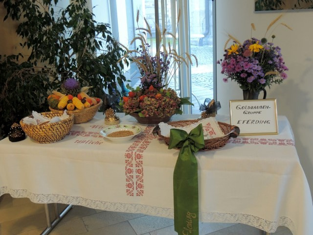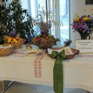 Beim Festgottesdienst wurden Gaben zum Altar gebracht: Brot, Wasser und Wein als Symbol für das Leben, Gemüse und Obst für die Fülle, Werkzeug für die tägliche Herausforderung im Arbeitsleben, Blumen für das Schöne, und ein leeres Körbchen für die unbezahlte und ehrenamtliche Arbeit, ohne die das menschliche Zusammenleben schwer wäre.