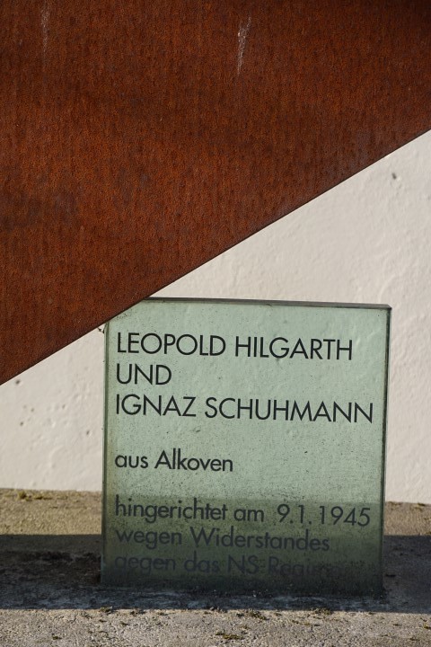 Beim Widerstandsdenkmal an der Schlossmauer erinnert Mag.a Irene Zauner-Leitner an die beiden Alkovener Widerstandskämpfer Ignaz Schuhmann und Leopold Hilgarth, die im Jänner 1945 in Wien enthauptet wurden.
