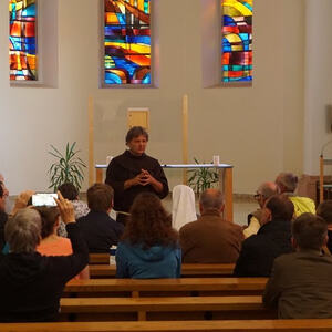 Pater Fritz erzählt den Gästen von der stets offenen Klosterpforte und der Kirchentür, vom Hl. Franziskus, der in seinem Leben große Sensibilität für Menschen mit sozialen Schwierigkeiten entwickelte, von der Klostergemeinschaft, die alles selber macht, die ohne Angestellte auskommt.