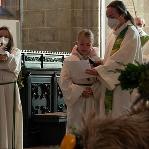 18 Ministranten und Ministrantinnen brachten bei der Gabenbereitung ihre eigene Perspektive dieses Festes mit ein - Erntedank aus der Sicht von Kinderaugen!
