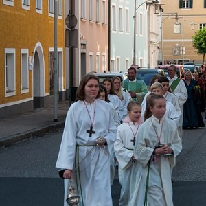 Die feierliche Prozession vom Brunnenplatz vor dem Schloss zur Kirche wurde begleitet von der Eferdinger Stadtkapelle, der Goldhaubengruppe, den GottesdienstleiterInnen, den Ministrant/Innen und den Gläubigen der Pfarrgemeinde.