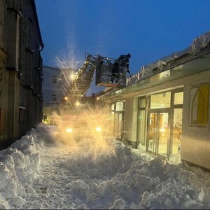 Eine "Lawine", die sich vom Kirchendach löst, macht eine Sperre des Südportals der Kirche notwendig.