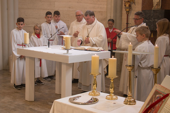 Der Festgottesdient wurde von Bischof Dr. Scheuer gehalten. Wunderbar wurde die Feier von unserem Chor EcanTo unter der Leitung von Johannes Weilhartner gestaltet. Bischof Dr. Scheuer segnete die sanierte Kirche und weihte den Altar und die Reliquien, die dann in der Bodenplatte versenkt wurden. Mit dem gemeinsam gesungenen „Großer Gott wir loben Dich“ wurde der Festgottesdienst abgeschlossen.