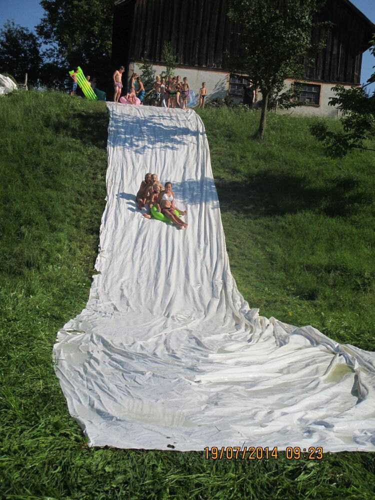 Anschließend packten wir unsere Sachen und gingen der nächsten Überraschung entgegen. In Höribach durften wir uns auf einer riesigen Wasserrutsche abkühlen und hatten dabei natürlich sehr viel Spaß. Zum Abschluss gab es noch gegrillte Würstchen und Sauerkraut.