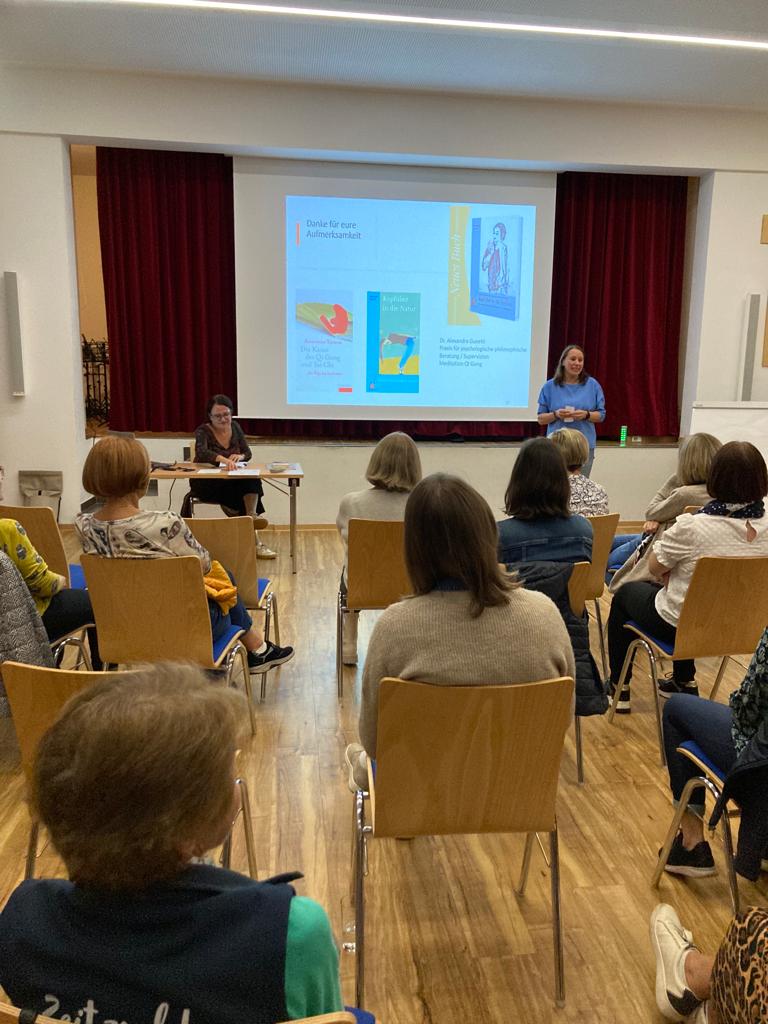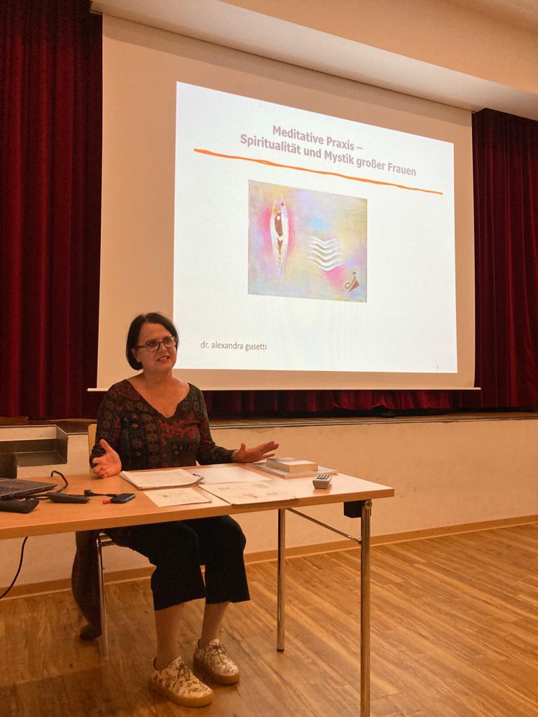 Gemeinsam mit der kfb hat das kbw Eggerding/Mayrhof den Vortrag zum Thema „Meditative Praxis – Spiritualität und Mystik großer Frauen“ am 23. Oktober 2023 veranstaltet. Frau Gusetti lud uns ein auf den Spuren großer Frauen zu wandeln und erzählte 21 Frauen von der Entstehung der Meditation und erläuterte die verschiedenen Arten. Techniken die heutzutage mit Begriffen wie Achtsamkeit und Resilienz beworben werden, haben eigentlich schon diese Frauen im Mittelalter beschrieben und verbreitet. Besonders beeindruckend war dabei der Beitrag der Frauen christlichen Glaubens, da man Meditation etc. oft den östlichen Kulturen zuspricht. Zwei besondere Frauen sind Margareta Porete und Teresa von Avila deren Werke aus 1300 bzw. 1570 noch heute Gültigkeit haben. Mit einem „Frauencocktail“ und Keksen nach Hildegard von Bingen ließen wir den Abend gemütlich ausklingen.