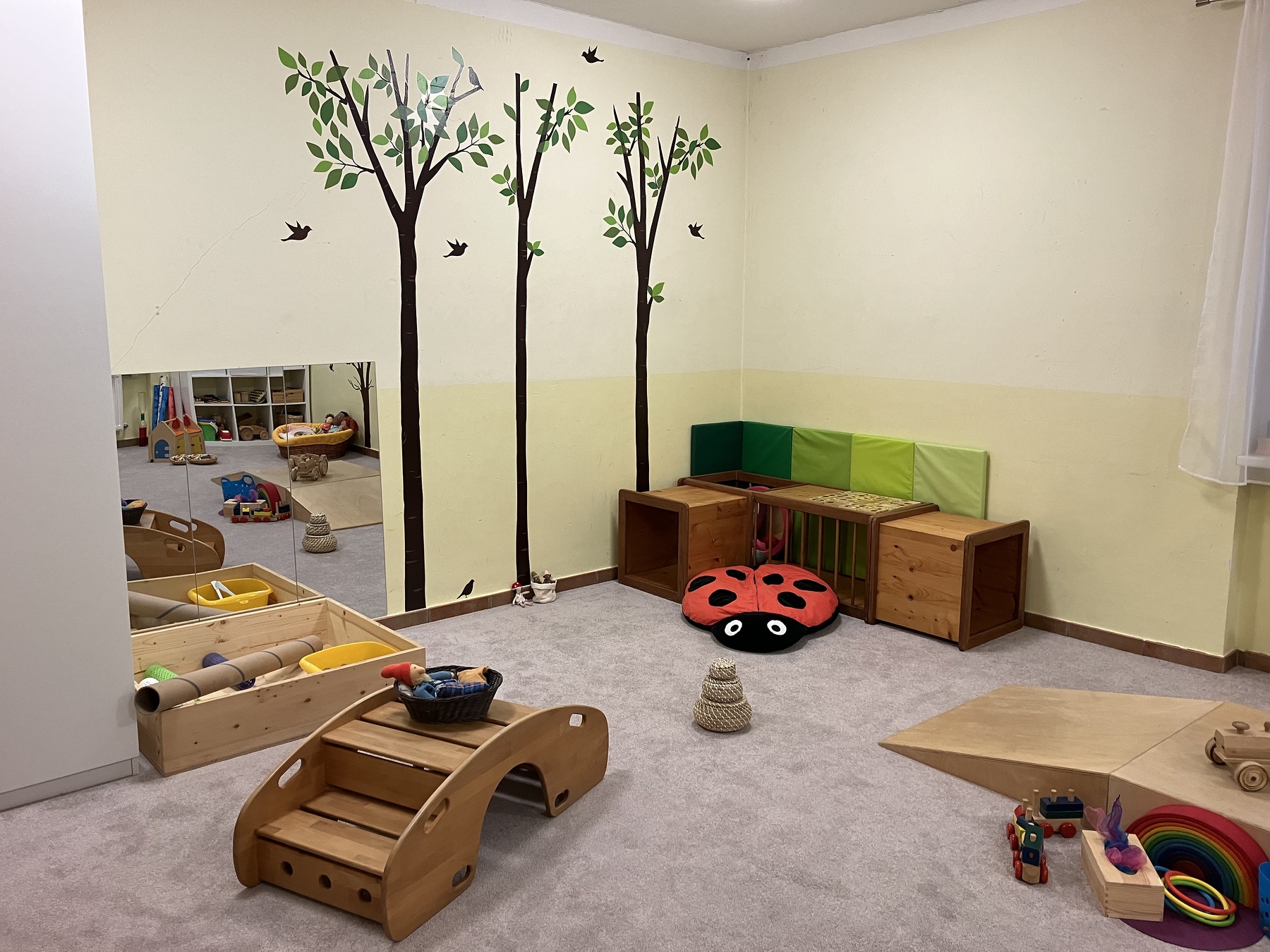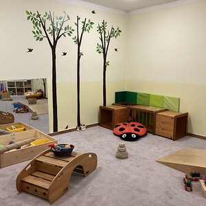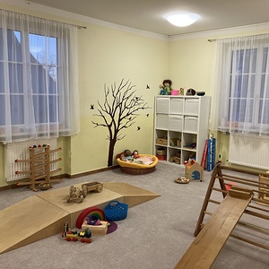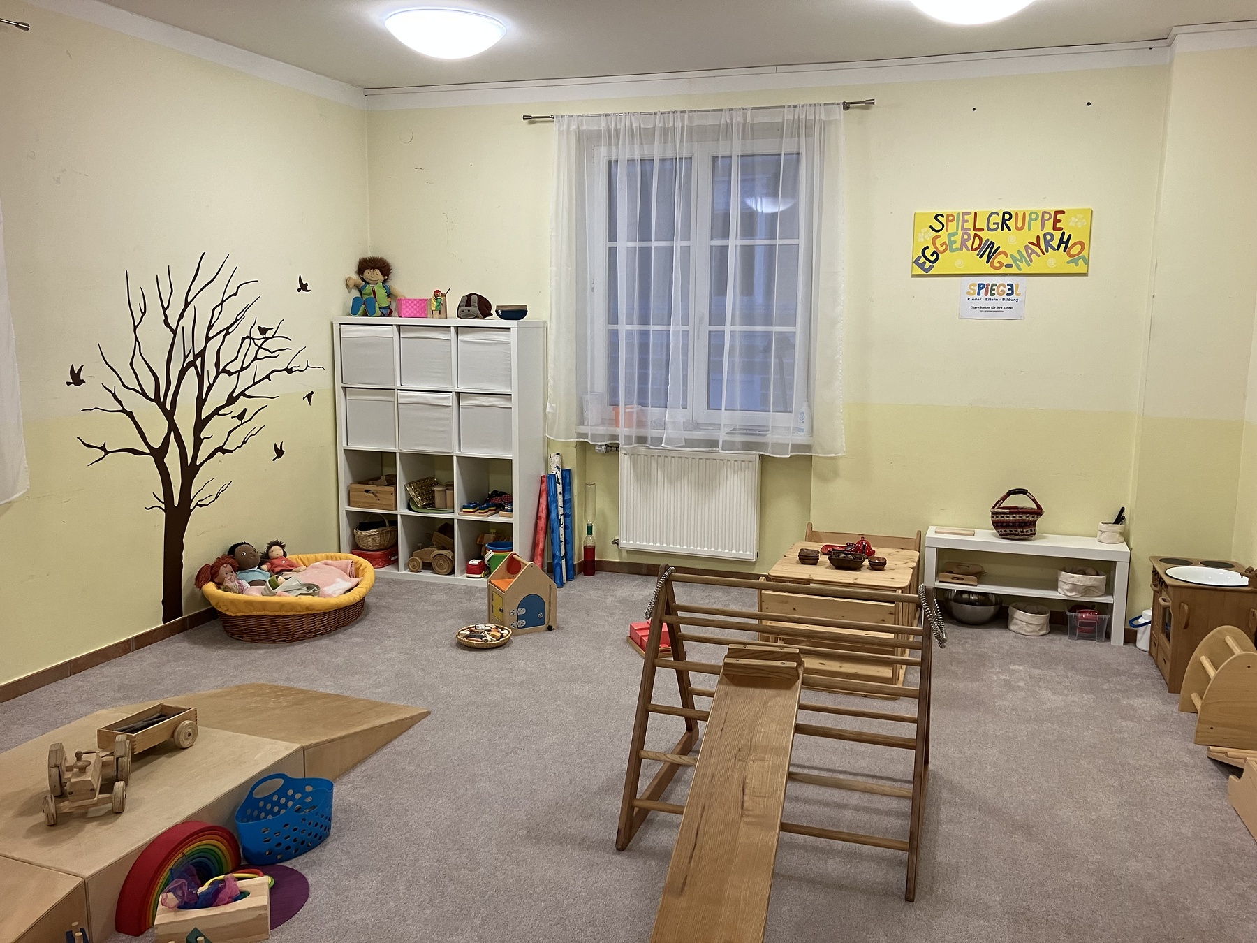 Der Spielgruppenraum im Brambergersaal ist mit Pädagogisch wertvollen Spiel- und Bewegungsmaterialien ausgestattet die den jeweiligen Entwicklungsstand des Kindes entsprechen. In der Gruppe wird die Bewegungsentwicklung der Kinder nicht aktiv gefördert, sondern die Umgebung so vorbereitet, dass die Kinder durch das Materialangebot motiviert sind auszuprobieren und neue Bewegungsmöglichkeiten zu üben.
