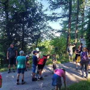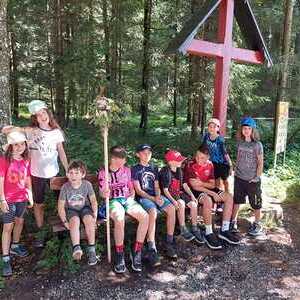 Unter den mächtigen Laubbäumen war der richtige Rastplatz am Weg zum Roten Kreuz. Hier spürten wir die Kraft der Bäume und barfuß das weiche Moos und den regengetränkten Waldboden. Obwohl es soo schön war, marschierten wir weiter und stärkten uns beim Roten Kreuz, wie Elija in der Bibelgeschichte, mit Brot und Wasser. Beim Abstieg galt es noch einmal die Ohren zu spitzen und so viele Geräusche wie möglich zu hören.