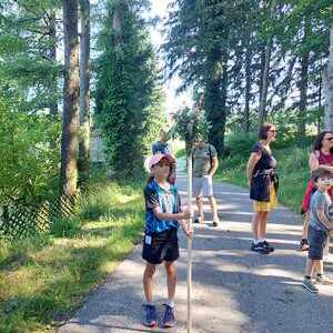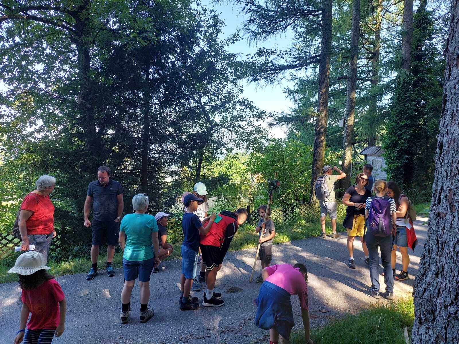 Um die 30 Personen folgten der Einladung der Kinderliturgieteams Eidenberg und Geng und pilgerten am Sonntag, 13. Juli im Morgentau los. Mit Gottes Segen und einem Heilkräuterbuschen am Wanderstab schafften wir den ersten Anstieg zur Eidenberger Alm. Dort gab es im Wald die erste Pause und Aufgabe. Genau schauen! Die Tiere und Pflanzen, an denen wir sonst achtlos vorbeilaufen, wurden beobachtet und Danksätze an Gott formuliert. Bald darauf erreichten wir die Schönangerkapelle, wo wir eine kurze Andacht feierten.