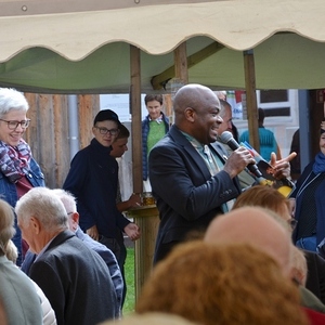 Nach der Feier eines gemeinsamen Wortgottesdienstes begrüßte PGR-Obmann Thomas Schwierz die Gäste im Innenhof des Moarhofs. Etwas später gesellte sich auch Kaplan Ezeugo zu uns.