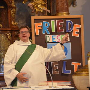 Im Lukas-Evangelium (Lk 10,1-9) hörten wir, wie Jesus seine Jünger aussendet, um Frieden in die Häuser zu bringen. Friede ist wohl das Schönste, was man jemanden wünschen kann. In einer Welt, in der Streit, Krieg und Terror herrschen, sehnen sich die Menschen nach Frieden. Kinder und Erwachsene brachten Gedanken zum Frieden zum Altar: