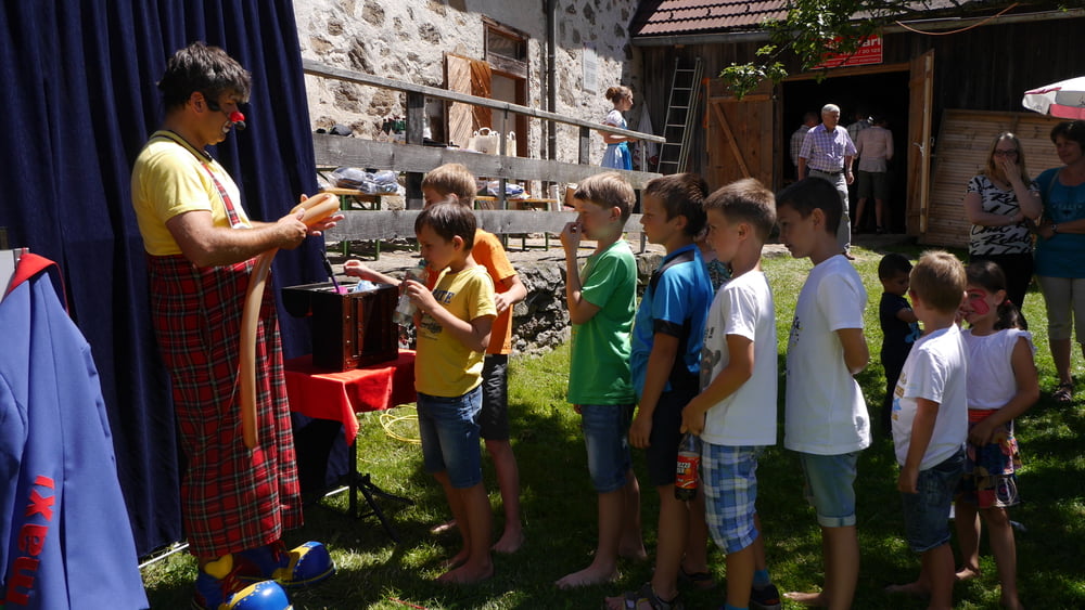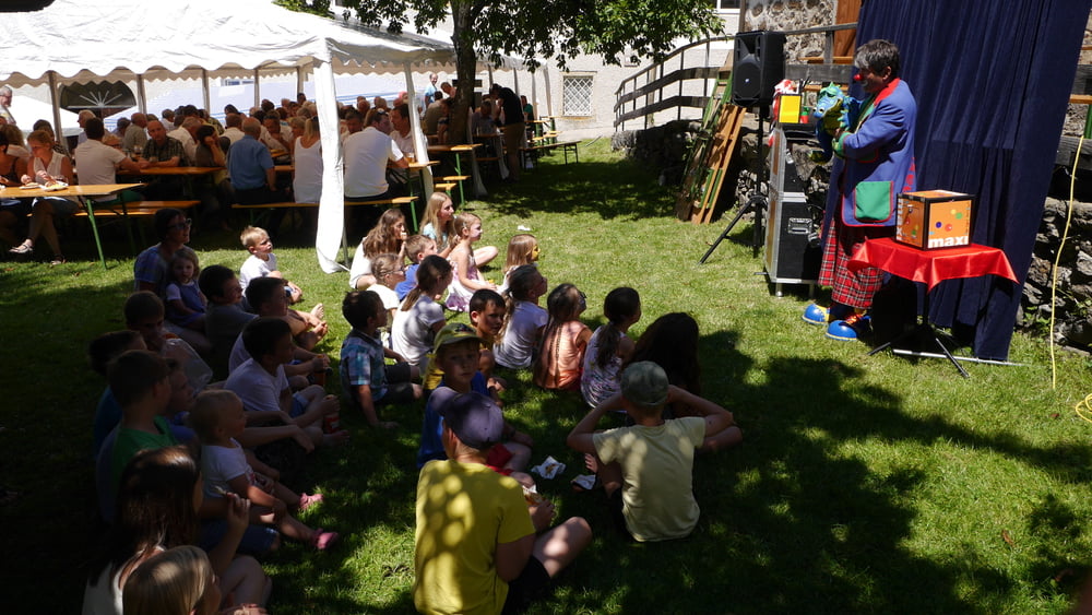 ZUr Feier des Tages und zur Freude der Kinder zauberte Clown Maxi und sein sprechendes Krokodil wilde Tiere in eine Kiste. Der Würfel in der "Würfelverschwinde-Maschine" wollte dennoch nicht verschwinden....