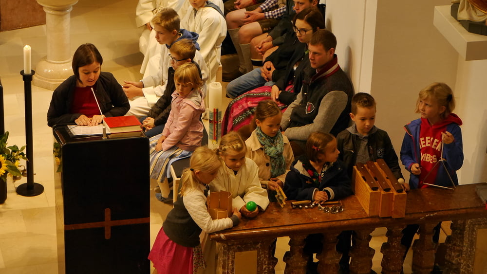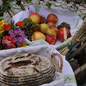 Nach der Kommunion nahm die Religionslehrerin die Mitfeiernden mit auf den Weg des Samens: Zur Aussaat, zum Warten auf Regen und Sonne, zum Keimen und Reifen. Die Geschichte wurde von den Schülerinnen und Schülern mit Klanginstrumenten untermalt. Mit den Liedern „Gottes Gaben sind so wunderbar“ und „Großer Gott wir loben dich“ fand der Dankgottesdienst einen feierlichen Abschluss. Am Kirchenplatz wurden die gesegneten Brote und Früchte verteilt und gemeinsam gegessen.
