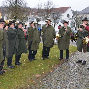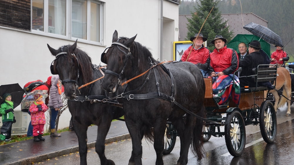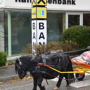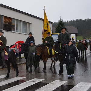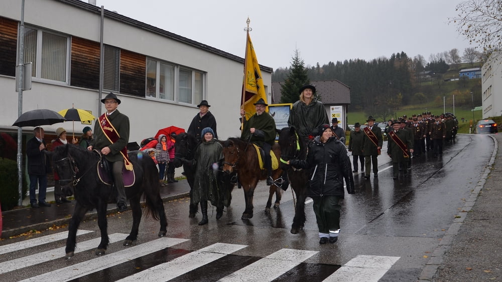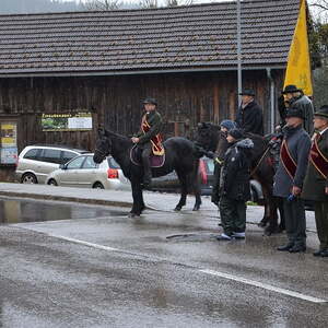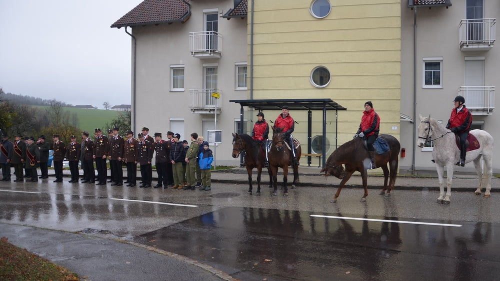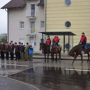 Zur Pferdesegnung nahmen die Reiter von der Kirchenstiege bis zur Kreuzung auf der Straße Aufstellung. P. Ewald würdigte die Pferde als Arbeits- und Freizeitgefährten des Menschen und vertraute im Segen die etwa 25 Pferde der Fürsprache des heiligen Leonhard an. Die Feuerwehrbuben teilten an die Rösser geweihte Brote aus. Da sich der Regen zunehmend mit Schneeflocken vermischte, traten die Reiter nach der Pferdesegnung den Heimweg an.