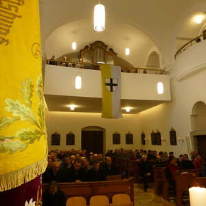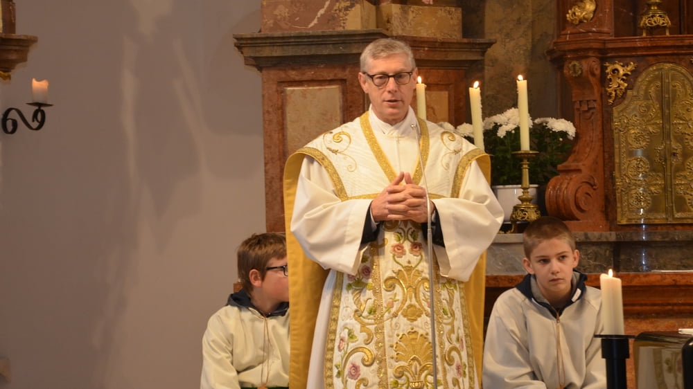 Um die Festlichkeit des Tages hervorzuheben, wählte P. Ewald als liturgische Farbe Weiß wie an Hochfesten. Wir hatten in der Kirche alle Kerzen angezündet und als besonderen Willkommensgruß über die Chorbrüstung eine Kirchenfahne mit dem Wappen des Deutschen Ordens (Orden der Brüder vom Deutschen Haus Mariens in Jerusalem) gehängt, dem P. Ewald angehört.
