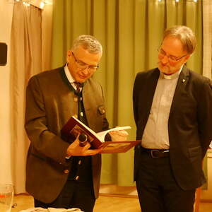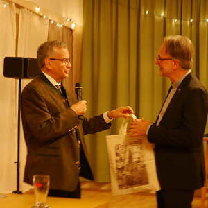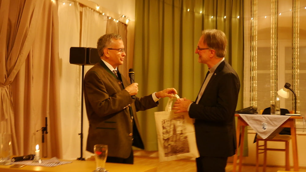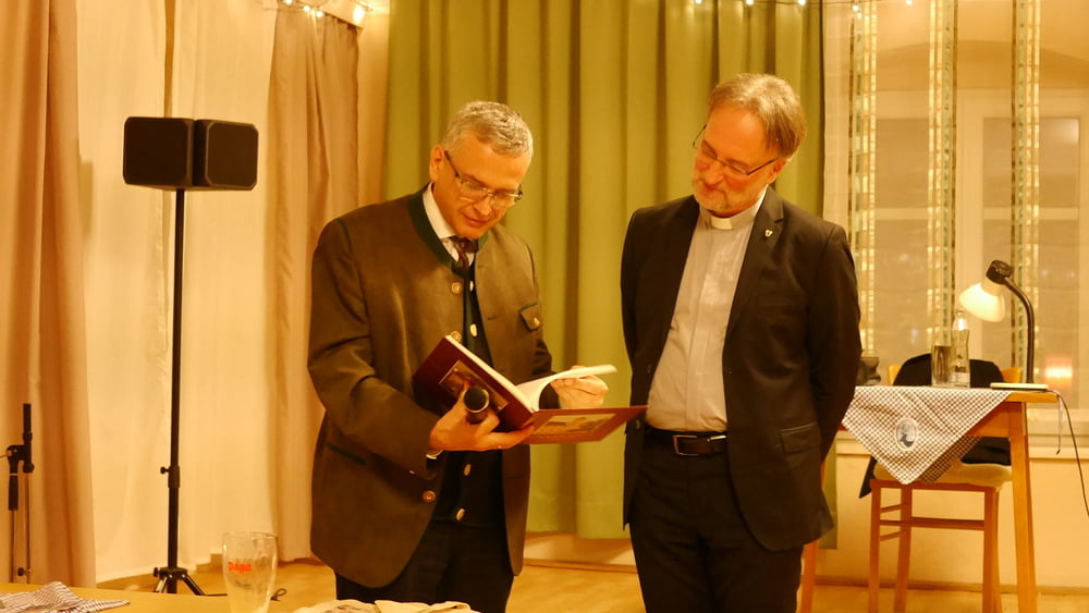 Im Namen des Seelsorgeteams bedankte Thomas Schwierz sich beim Referenten mit einem Buch über Kirche und Moarhof in Eidenberg und einer Packung Gramastettner Krapferl. Höberth und Schwierz gehören beide dem Deutschen Orden als Familiare an.