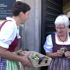 P. Maximilian trug das Evangelium feierlich vor wie ein Opernsänger. Am Ende des Gottesdienstes weihte P. Maximilian die Büscherl, die an den Kirchentüren an die Besucher ausgeteilt wurden. Was an Büscherl zu viel war, brachten wir in die Geng und verteilten sie beim Pfarrfrühschoppen.