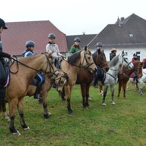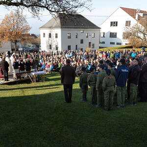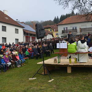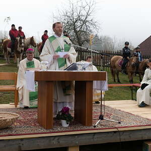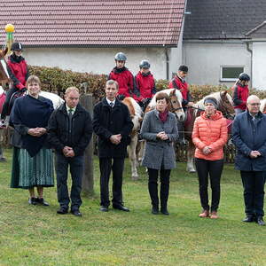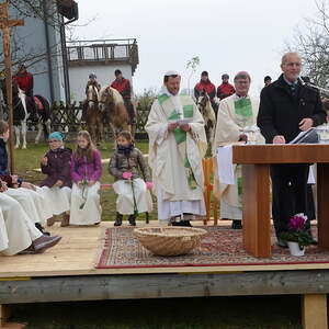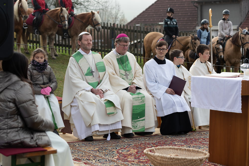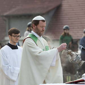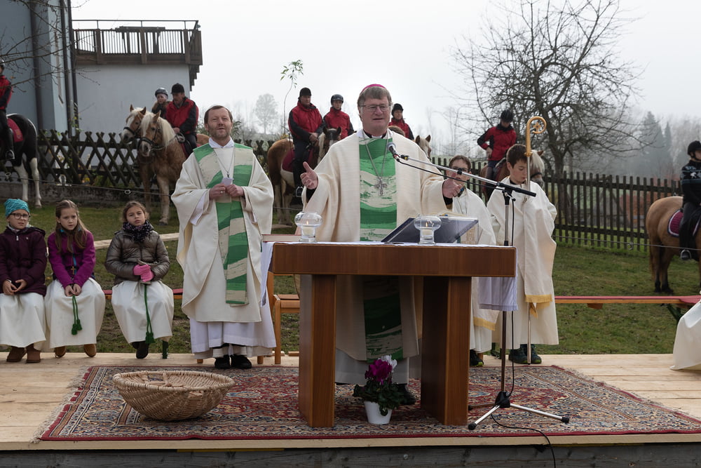Zum Festgottesdienst und der Pferdesegnung hatten die Reiter auf der Festwiese Aufstellung genommen. Bischof Manfred segnete die etwa 40 Pferde. Die Feuerwehrburschen und Mädchen verteilten geweihte Brote an die Pferde.
