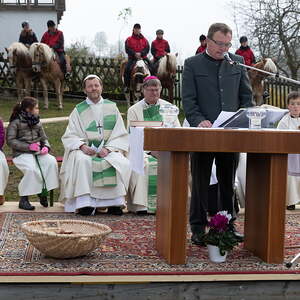 Nach der Begrüßung durch Ortsbauernobmann Gottfried Mair hielt Bürgermeister Adi Hinterhölzl eine kurze Ansprache, in der er Leonhardi als das Fest für die Pferde nach getaner Jahresarbeit würdigte. Abt Reinhold schloss sich den Grußworten an und bat den Bischof um die Zelebration der Feldmesse.