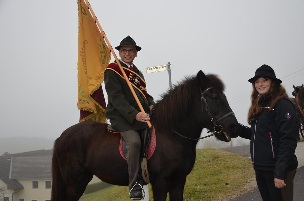 Begleitet vom Kreuzträger und den Ministranten fuhren Bischof und Abt in einer Kutsche dem auf der Eidenbergstraße aufgestellten Festzug entgegen.