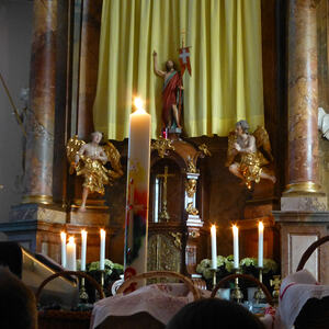 Die Osternacht feierte der Abt mit uns. Nach der Feuerweihe auf dem Kirchenplatz zogen Volk, Ministranten, Diakon Hubert Mayr und Abt Reinhold in die übervolle Kirche ein, in der noch die letzten Sonnenstrahlen durch die Fenster drangen und den hl. Donatus mit den Blitzen an der Säule in ein weiches Licht tauchten – fast eine Parallele zur Lesung vom Auszug der Israeliten durch das Rote Meer, wo der Herr durch eine Feuersäule das Heer des Pharao nicht näherkommen ließ. Der römische Heerführer Donatus war durch ein heftiges Gewitter vor der Vernichtung durch die Markomannen bewahrt worden.