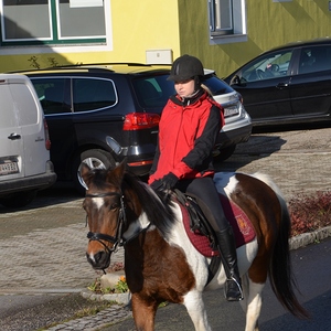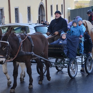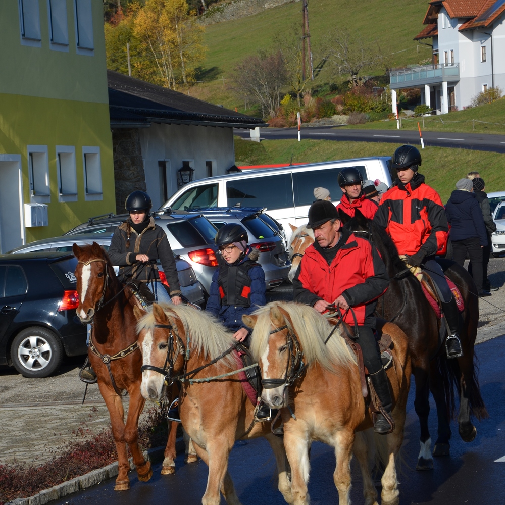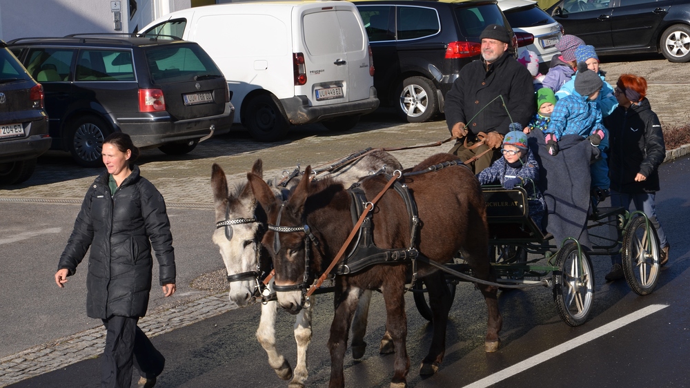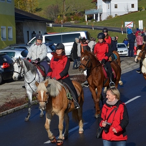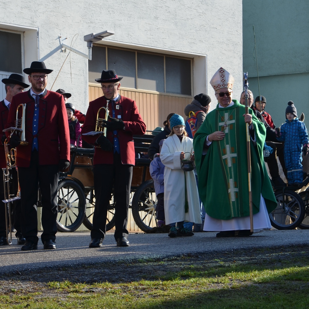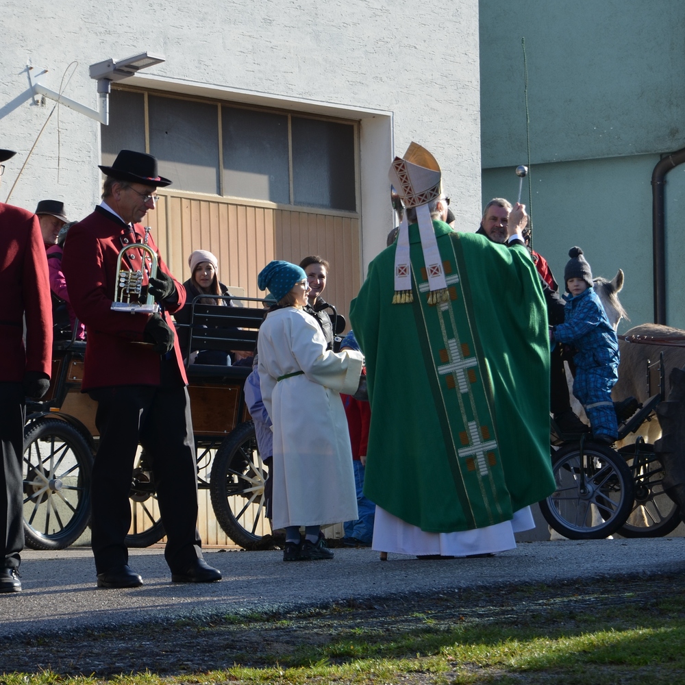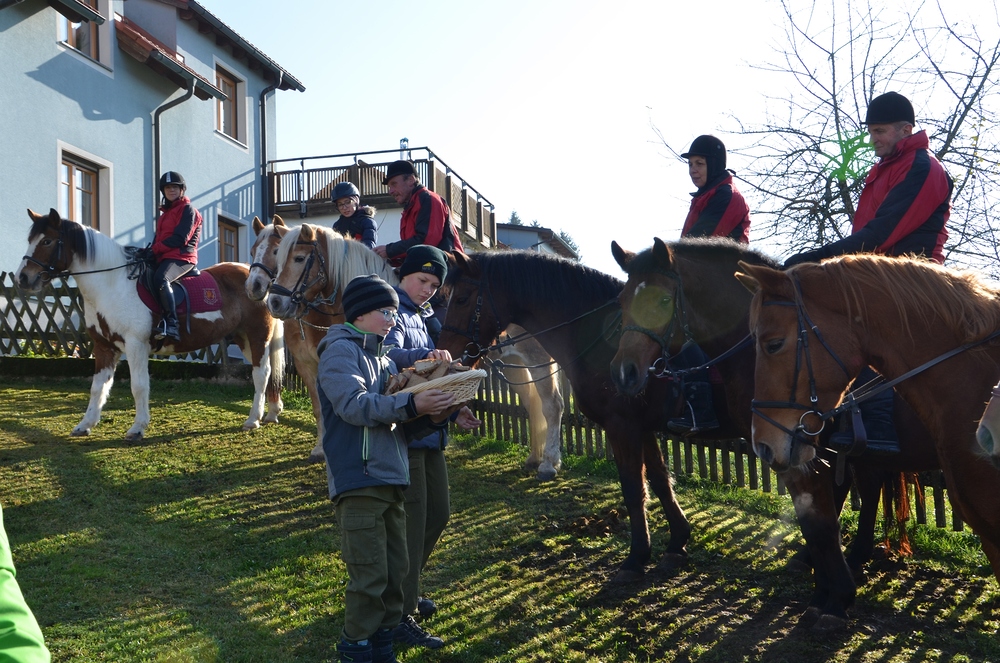 Der Althochmeister ging mit den Ministranten durch die Reihen der Pferde, um sie zu segnen. Die Feuerwehrburschen und Mädchen verteilten geweihte Brote an die rund 40 Pferde.