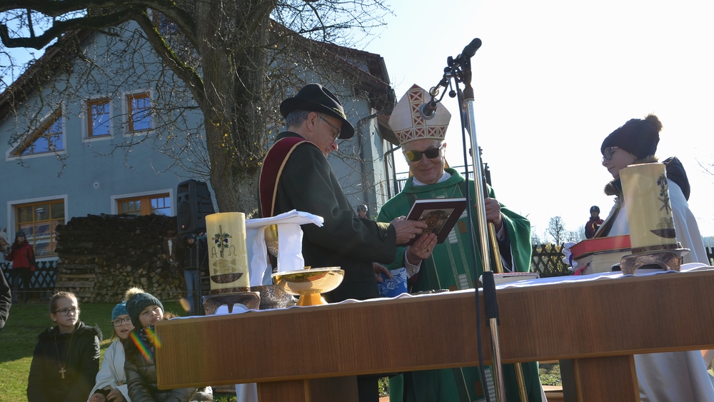 Ortsbauernobmann Gottfried Mair bedankte sich beim Althochmeister mit einem Bschoardbinkerl. Thomas Schwierz überreicht im Namen der Pfarre ein Buch über die Kirche in Eidenberg.
