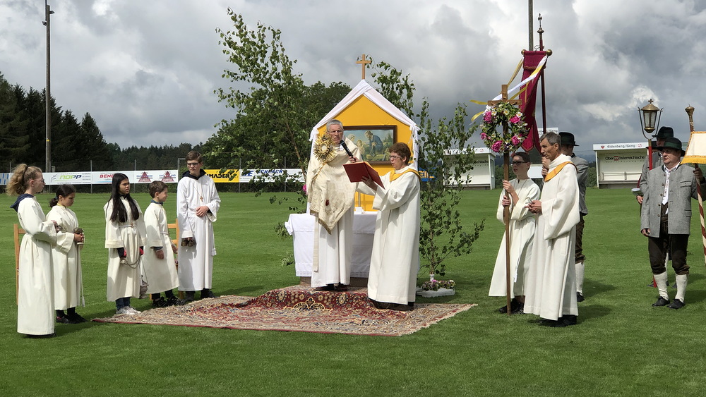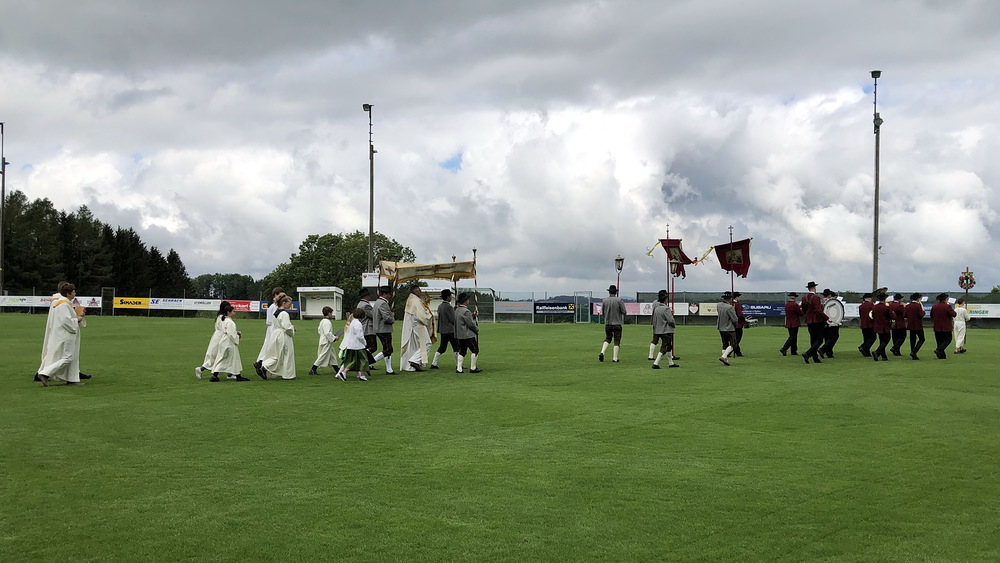 mit der Monstranz unter dem Himmel, den Mitglieder der Lederhosengruppe trugen, von der Kirche zum Sportplatz. Den Zug bildeten der Kreuzträger, ein kleine Abordnung der Musikkapelle, die Fahnen und Laternenträger, das Allerheiligste, die Ministranten und die beiden Wortgottesfeierleiter.