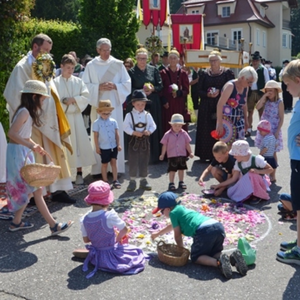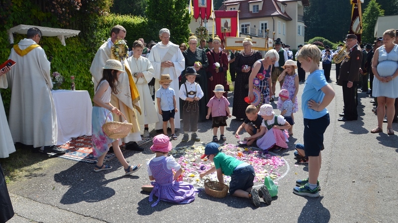 So waren die Kinder, zur Freude aller Mitfeiernden, aktiv in die Fronleichnamsprozession eingebunden und erfrischten mit ihrem Dabeisein die Feier.